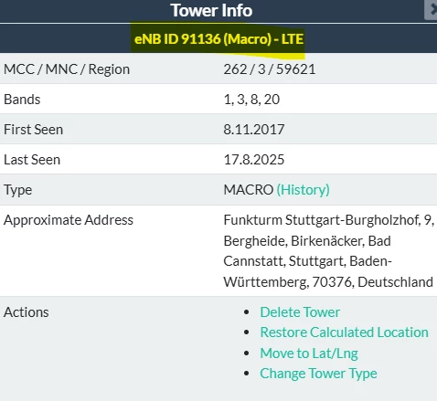 Ja, die Fritzbox zeigt leider manchmal auch nur die “Physical Cell ID” an. Diese findest du innerhalb Cellmapper unter “PCI”, und ist in diesen Fall, die Station in der “Unterländer Straße 68”.