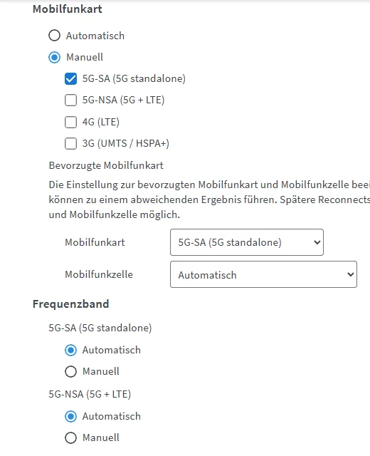 Gute Neuigkeiten, die dazu Buchung des 5G plus Paketes hat geklappt. Demnach müsste ich jetzt das 5G netz im Standalone (SA) Modus nutzen können. Wenn ich das alles richtig von euch verstanden habe, bin ich nun nicht mehr auf das bei mir sehr belastende bzw. ausgelastete 4g Netz angewiesen sondern kann das 5G alleine nutzen OHNE 4G, ergo sollte ich nun einen Performance-Sprung merken….
