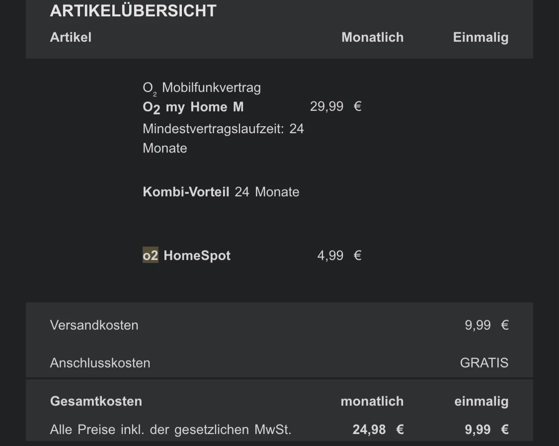 Ich hab vor circa einem Monat o2 M my Home Hotspot in Auftrag gegeben. Zusätzlich bekomme ich den Tarif günstiger, da ist bereits Kunde bin. Knapp eine Woche später werden mir Zusatzkosten für Anschlusskosten und Bereitstellung berechnet und abgebucht, obwohl ich den „Hotspot“ monatlich in Höhe von 4,99€ abbezahle. Zudem es hieß 0€ Anschlusspreis.