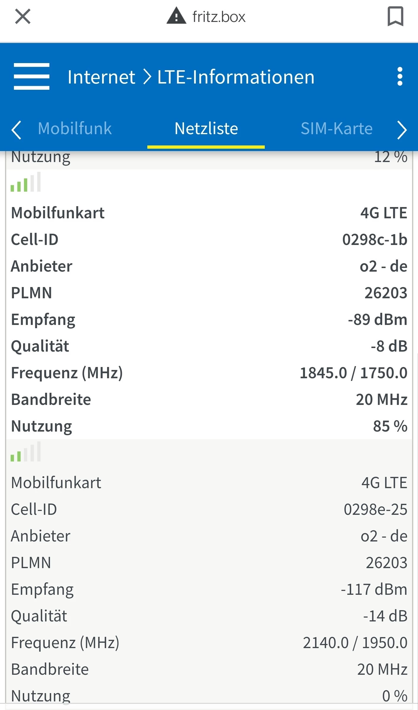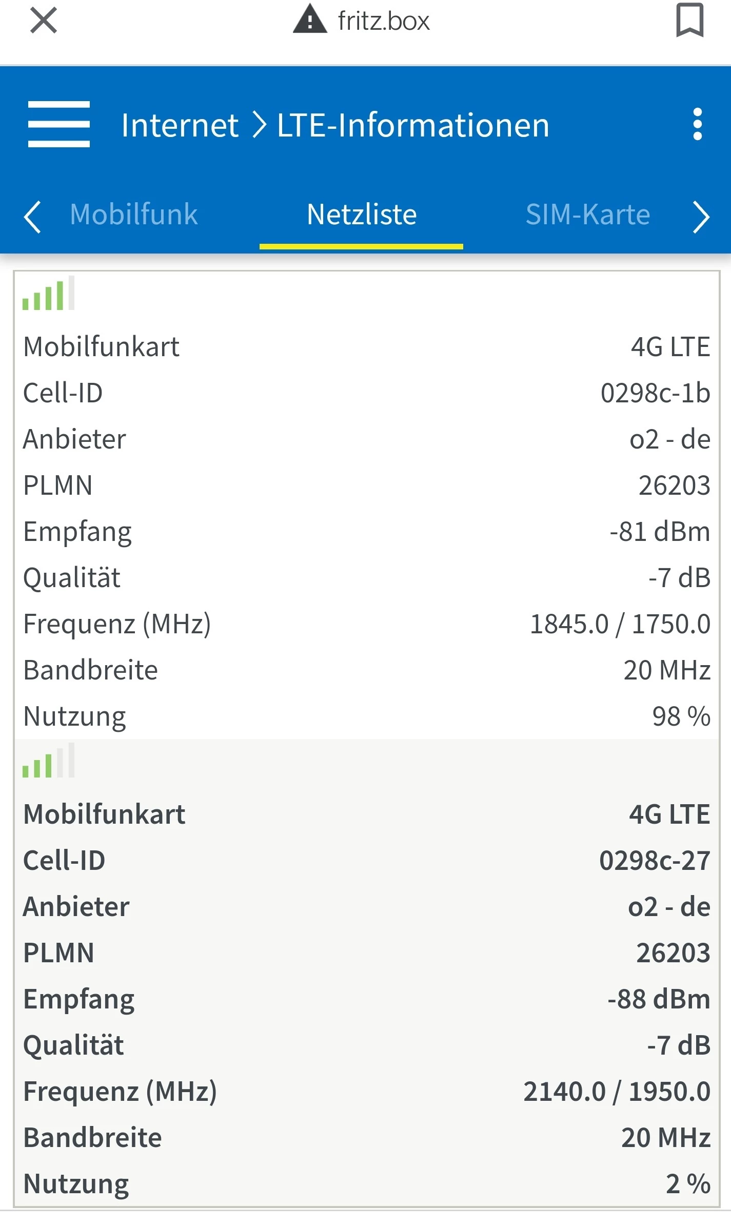 Beide Stationen sind gut drei Kilometer von dir entfernt. Ich finde es ist wenig sinnvoll, mit einen (vermutlich) LTE Cat 4 Router, über drei Kilometer eine Basisstation anzupeilen, nur weil es dort mehr als 10 MHz an LTE gibt.