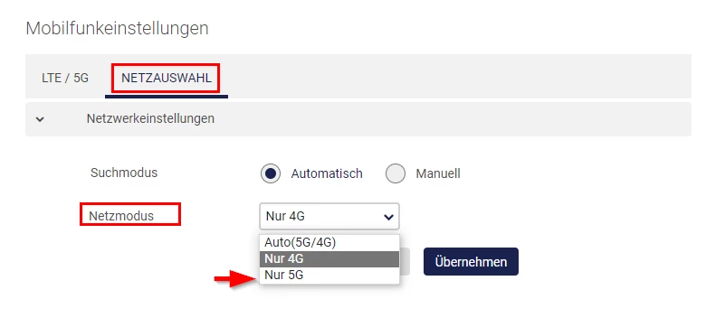 Router HomeSpot 5G - Netzauswahl fix auf Netzmodus "Nur 5G" funktioniert nicht