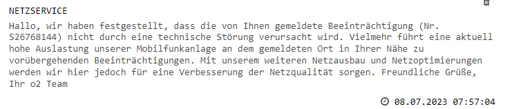 Ich hatte auch noch ein Ticket bei der o2 Netzstörung mit dem Live-Check erzeugt und folgende Antwort erhalten: