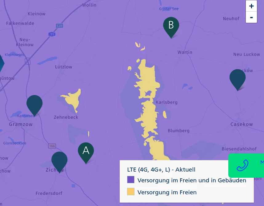 Im Bereich “B” würde ich mich an deiner Stelle nach Alternativen umsehen. In diesen Bereich könnte es vielleicht noch helfen, den Router an ein Fenster in Richtung “Luckow” auszurichten, denn die o2 Basisstation bei “Sommersdorf” bietet leider nur LTE 800 an, und zudem nutzt Vodafone das LTE 800 von o2 dort per MOCN Abkommen. (so dass diese Station gut überlastet ist)