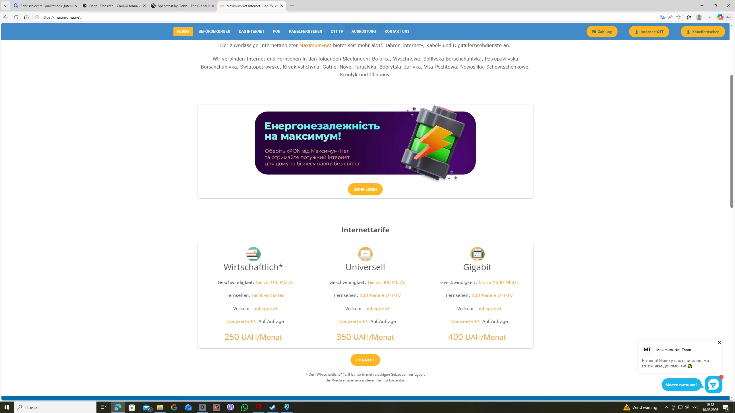 Zum Vergleich: In der Ukraine erhalten betroffene Kunden in einem solchen Fall automatisch nicht nur eine Benachrichtigung über die laufenden Arbeiten, sondern auch eine automatische Entschädigung mit einer Entschuldigung. Außerdem kostet Glasfaser-Internet mit einer Geschwindigkeit von 1000 Megabit pro Sekunde bis zu 15 Euro unbegrenzt. Eine Glasfaser-Internetgeschwindigkeit von weniger als 1000 bietet niemand an, denn das wäre einfach lächerlich. Und das in Zeiten des Krieges im Land und ständiger Raketenangriffe.