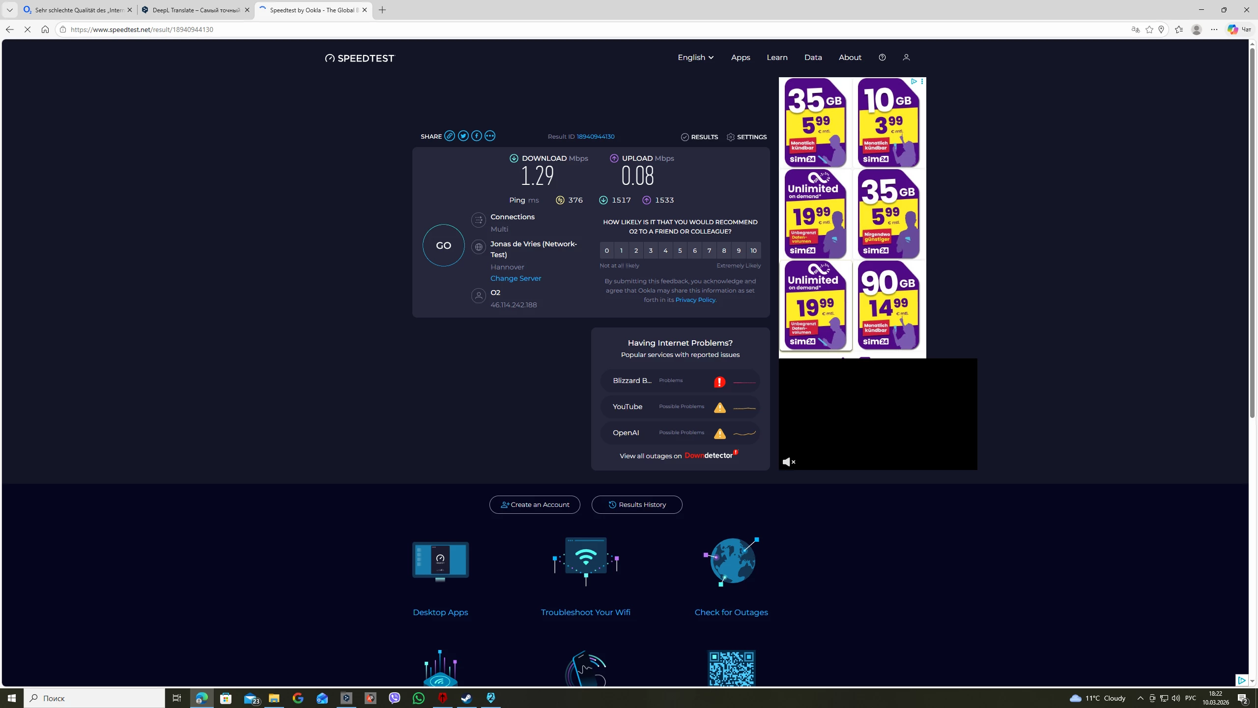 Guten Tag. Ich bezahle für einen Tarif, der eine Verbindungsgeschwindigkeit von 100 Megabyte pro Sekunde garantieren sollte. Nicht nur, dass ich diese Geschwindigkeit nie erreicht habe, maximal 80 Megabyte, sondern gestern und heute ist die Verbindungsgeschwindigkeit sogar auf 1-3 Megabyte pro Sekunde gesunken!!! Ich habe nachgeschaut, wo das Problem liegt – es gibt überhaupt kein 4G, 5G gibt es zwar, aber der Empfang ist minimal und offensichtlich kann es die ihm auferlegte Last einfach nicht bewältigen. Außerdem kann ich den technischen Support nicht erreichen – wenn ich in der Hotline die entsprechende Nummer für den technischen Support wähle, wird die Verbindung sofort unterbrochen!!! Ich habe es mehrmals versucht! Die auf der Website angegebene alternative Nummer scheint komplett abgeschaltet worden zu sein!