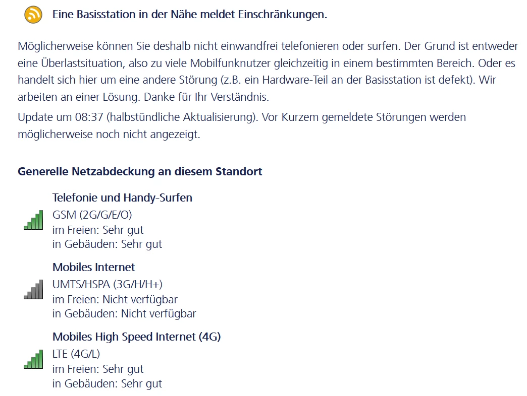 vielen Dank für die prompte Antwort! Ich hatte vor einigen Tagen bereits die O2-Störungsstelle kontaktiert, die mir jedoch mitteilten, dass “auch nacht intensiver Prüfung...” keinen Fehler finden konnten. Allerdings habe ich gestern und heute nochmals auf deinen Tipp hin die Netzstörungsseite aufgerufen, auf der ich tatsächlich eine Störungsmeldung für eine Basisstation in der Nähe bekommen habe (s.u.). Verblüffend ist nur, dass manchmal die Internetgeschwindigkeit wieder ansteigt, obgleich die Störungsmeldung dieselbe bleibt.