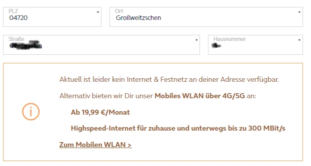 Dann konnte ich mir einmal die Daten deines Vertrages genauer anschauen und habe für die für ihn hinterlegte Adresse keine Einschränkungen in diesem Teil von Großweitzschen angezeigt bekommen: