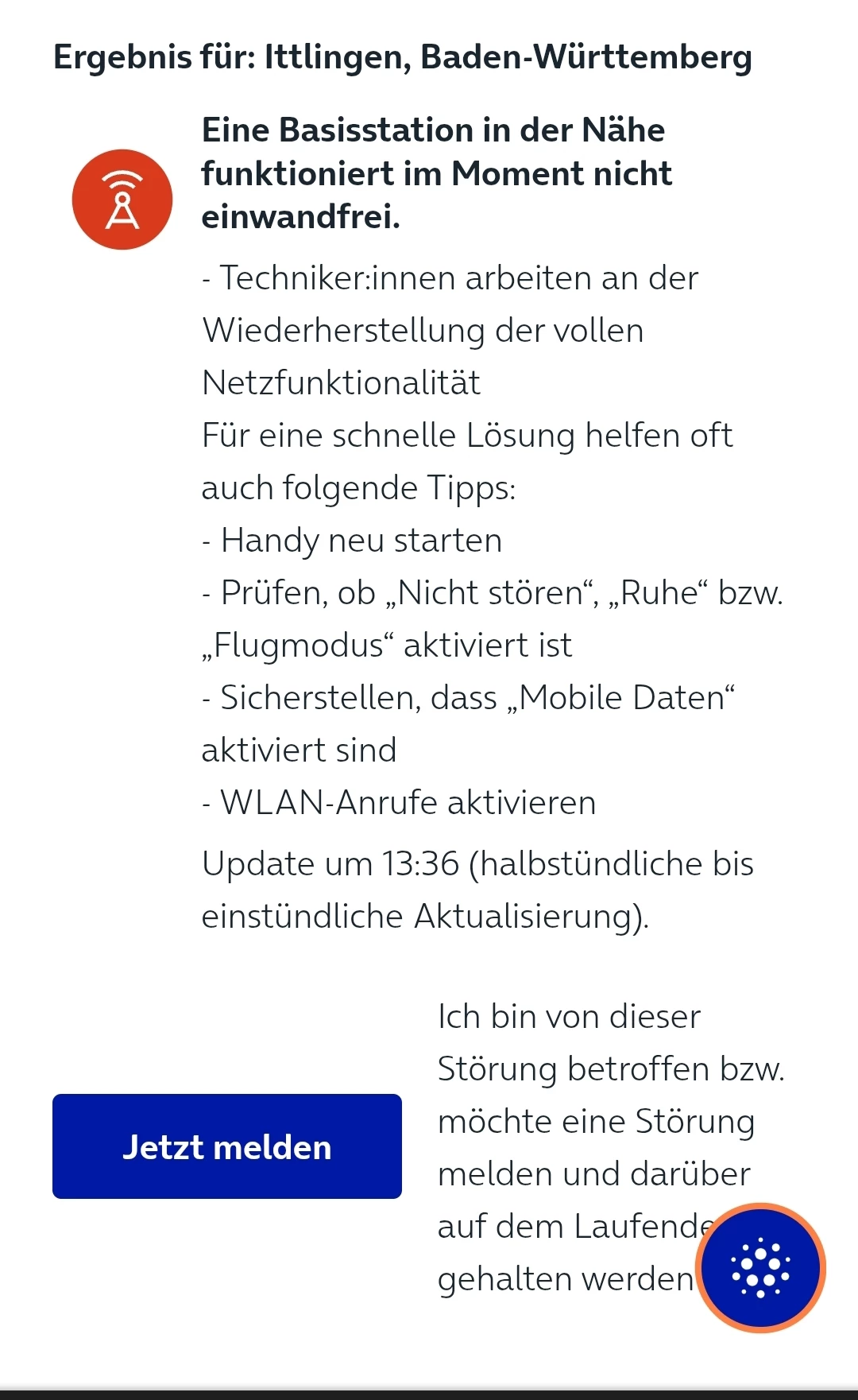 Seit dem 12.01.25 gibt es in 74930 Ittlingen einen ständigen Netzausfall, sowohl die mobilen Daten als auch das Mobilfunknetz fällt ständig aus. Es ist in unregelmäßigen Abständen da, für Minuten, manchmal für Stunden, zuletzt seit einem Tag, gestern ca. 11:00 Uhr bis heute ca. 12:40 Uhr, jetzt wieder weg! Regelmäßige Anrufe und Beschwerden bei O2 Service haben bis jetzt keine Lösung gebracht, die Mitarbeiter am Telefon können auch nichts dafür, aber es ist schon eine Schande.