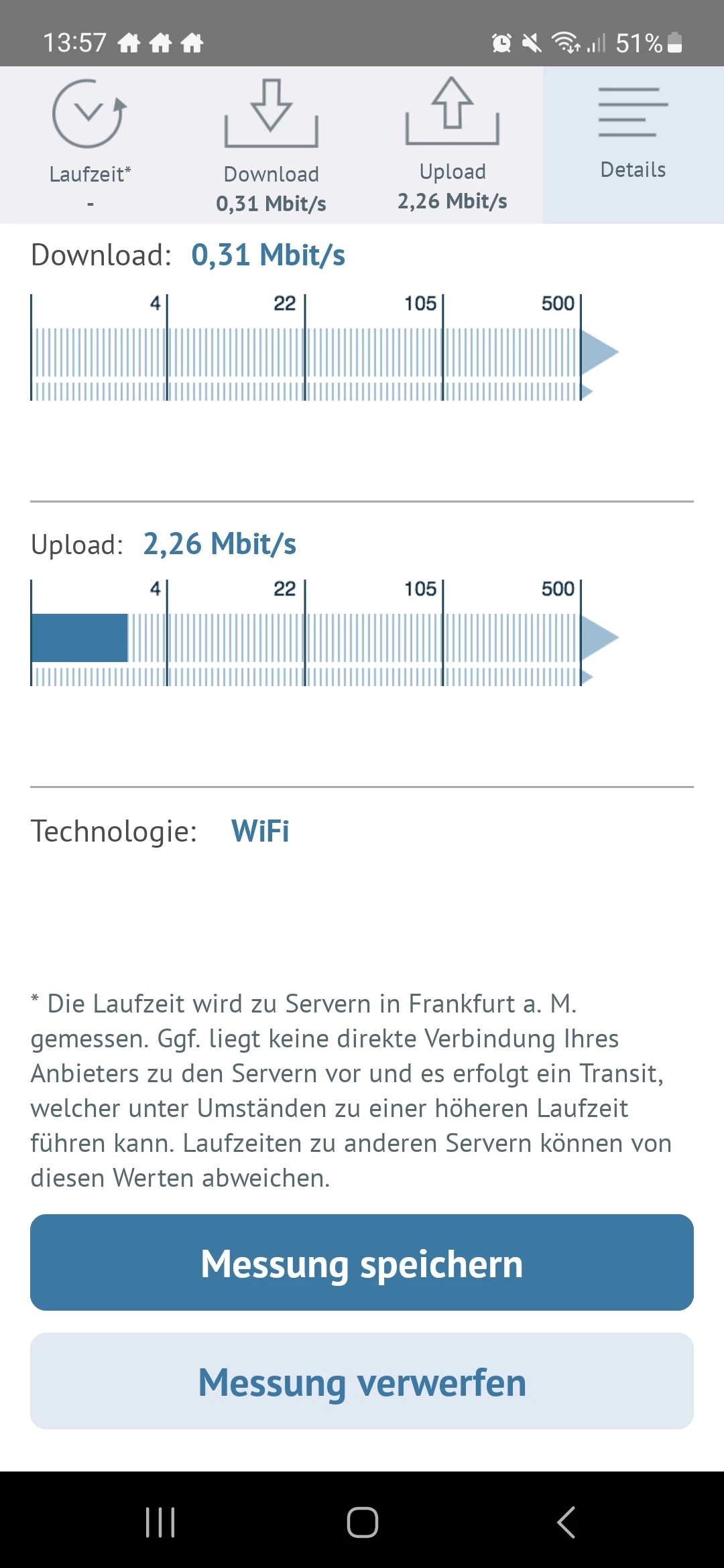 Ich habe mal einen Screenshot vom gegenwärtigen "zustand" mit der Breitbandmessung über WLAN gemacht . Erstaunlich dabei ist, dass bei gleicher Position, die Werte an meinem smartphone DEUTLICH  besser sind.