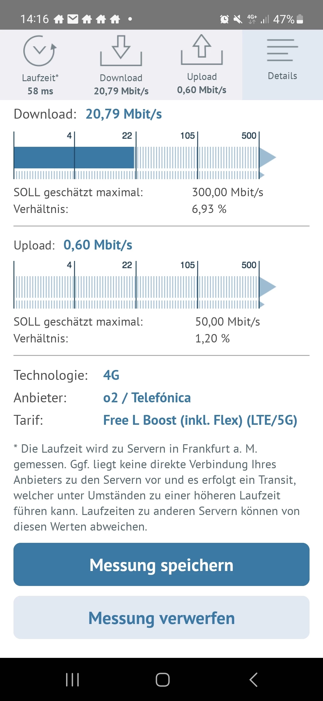 Mich wundert, dass ich mit meinem Handy, mit ebenfalls sim von o2, bessere Werte erziele.