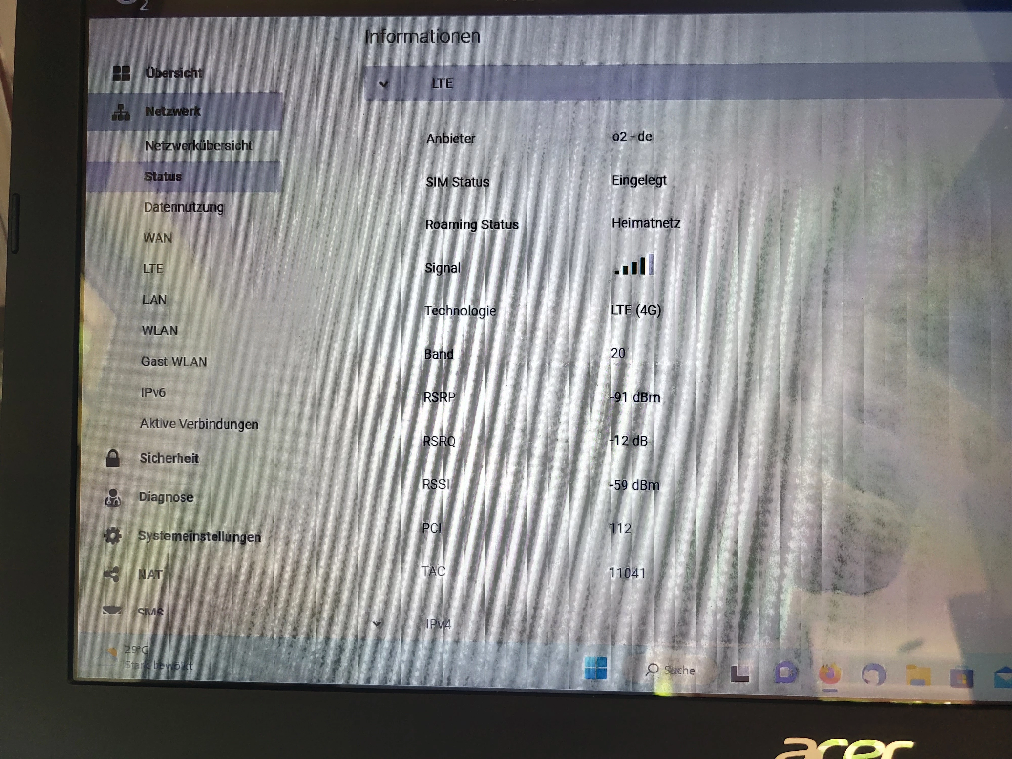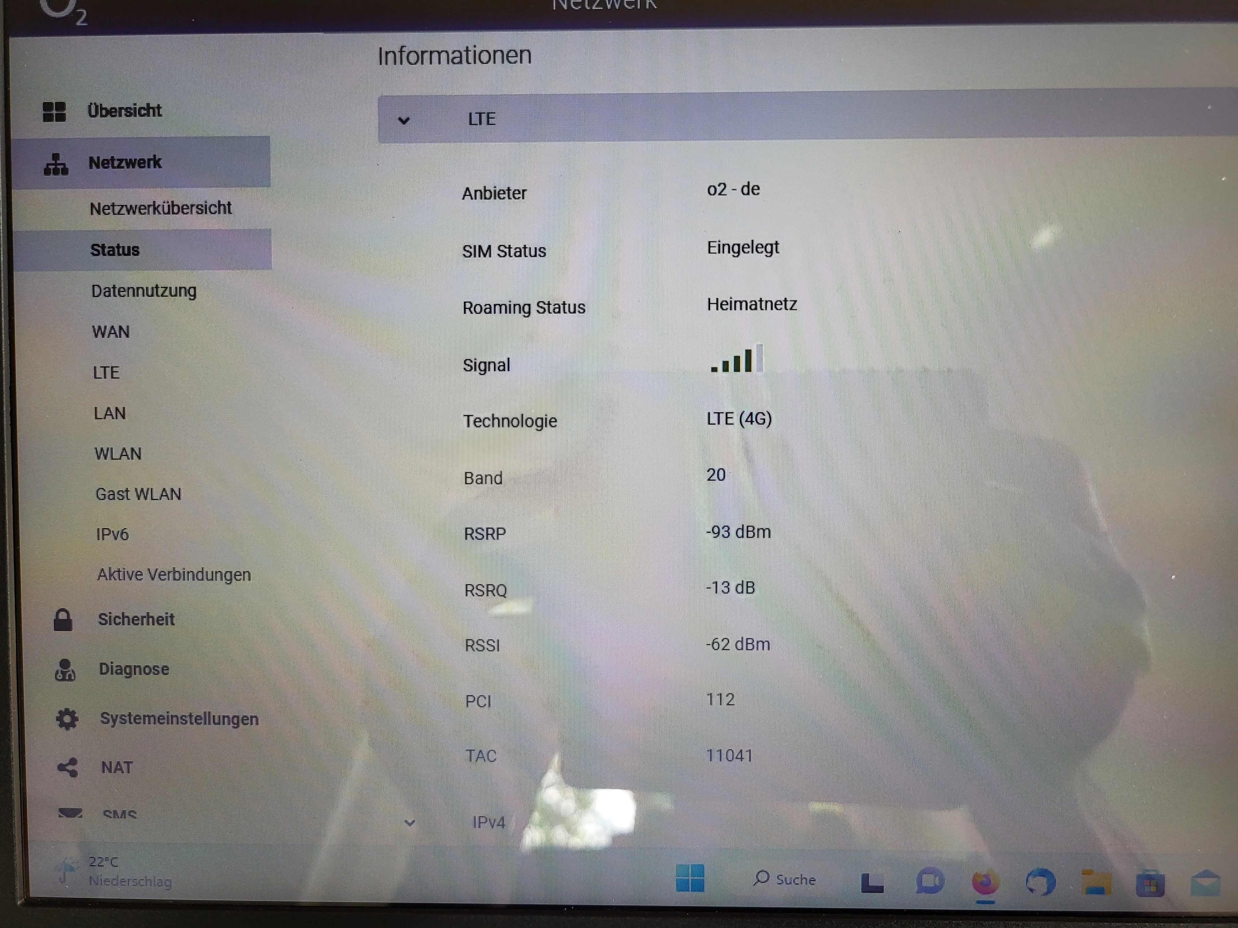 Eine Richtantenne haben wir ausprobiert, brachte aber nichts. Ich habe mal den Netzwerk Status abphotografiert. Vielleicht kannst du ja was damit anfangen.