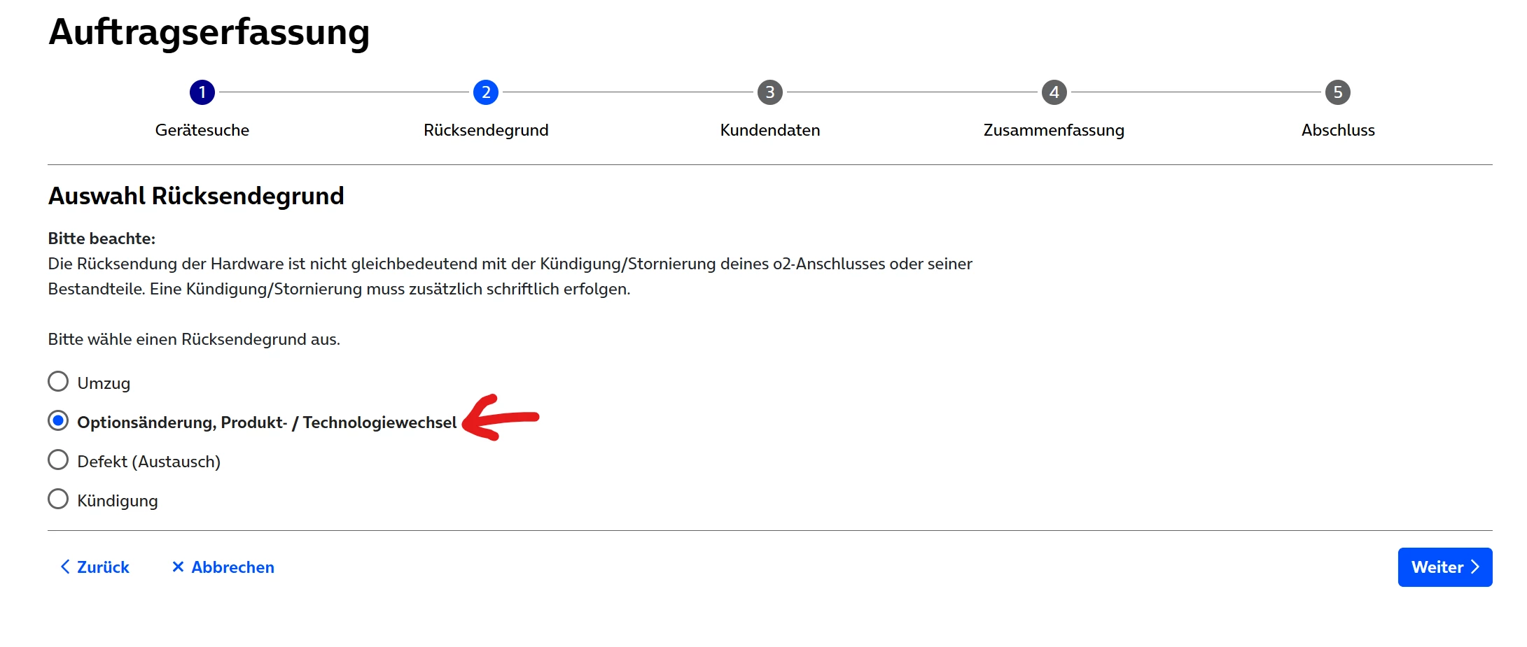 Hallo ​@SoultrainAD1267, das ist der richtige Link, den du sowohl von o2 _Maren als auch von GTO63 bekommen hast. Wähle bitte die Option “Kündigung” als Grund, da du den Router in diesem Fall kündigst.
