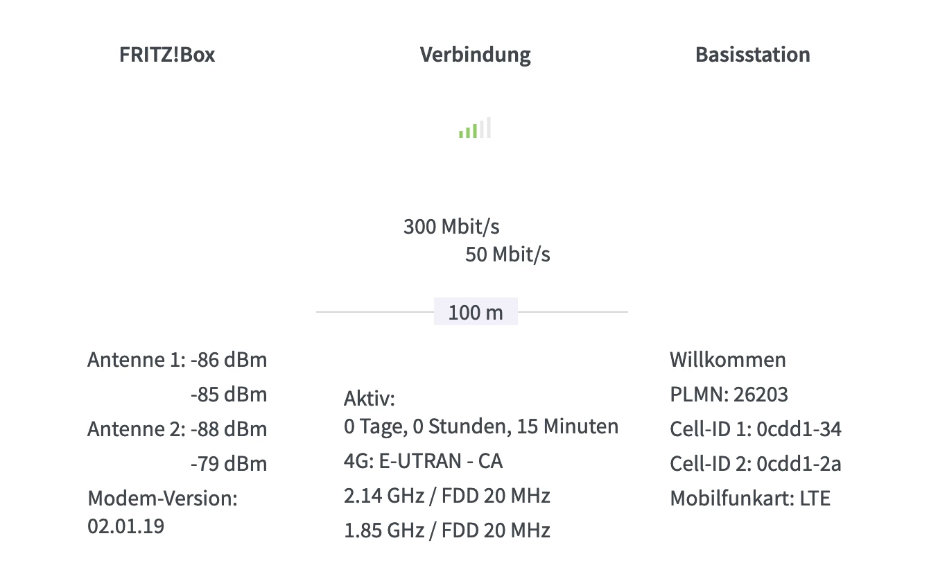 im Datennetz der Mast wurde wohl abgeschaltet oder… Hatte dann schon Hoffnung, leider war das nichts. Handy wieder normal, Internet wieder 50/32 wieder von meinem Mast gegenüber, meine Fritz 6890 LTE sagt 100m. Mein Tarif O2 my Home L (2020) 100 / 40 MBit.