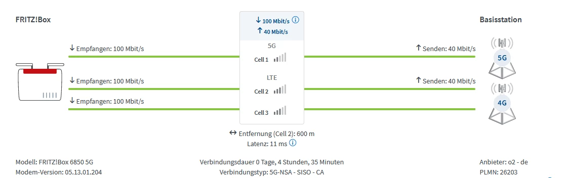 Moin. Ich habe zurzeit die O2 5G/LTE Testkarte (500MBit) für 30 Tage und verwende die FritzBox 6850 5G. Die FB verbindet sich mit ca. 200 - 300 MBit (2,1GHz LTE) zu meinem Funkmast. Wenn ich mit > 150/200 MBit verbunden bin erreiche ich locker die 100MBit real beim Download (ca. 11mb/s). Ab und zu bin ich aber nur mit 100MBit zum Mast verbunden, dann erreiche ich nur noch unter 50MBit real.