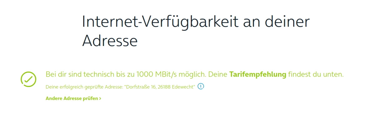 Hast du vielleicht mal die generelle Festnetz Verfügbarkeitsabfrage probiert? Denn ich hab das mal mit einer beliebigen Adresse in “Edewecht” getestet, und dort wäre beispielsweise Kabel-Internet verfügbar.