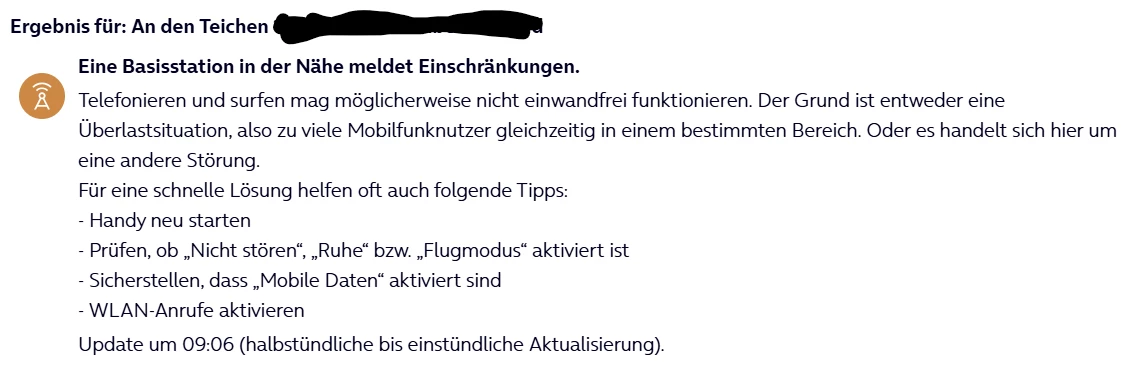 ich habe vom Live-Check per SMS die Benachrichtigung bekommen, dass keine technische oder netzbedingte Störung vorliegt, aber die bzw. eine Basisstation in der Nähe überlastet sei. Klingt plausibel für einen Laien. Spannend wäre aber die Frage, wann und wie Abhilfe geschaffen wird. Mir ist auch nicht klar, wodurch eine Überlastung eingetreten ist. Die SIM-Karte im Handy reagiert schneller als das vom Router empfangene und weitergegebene Signal. Ist seit 2-3 Wochen akut. D1 (Diensthandy) reagiert hier besser.