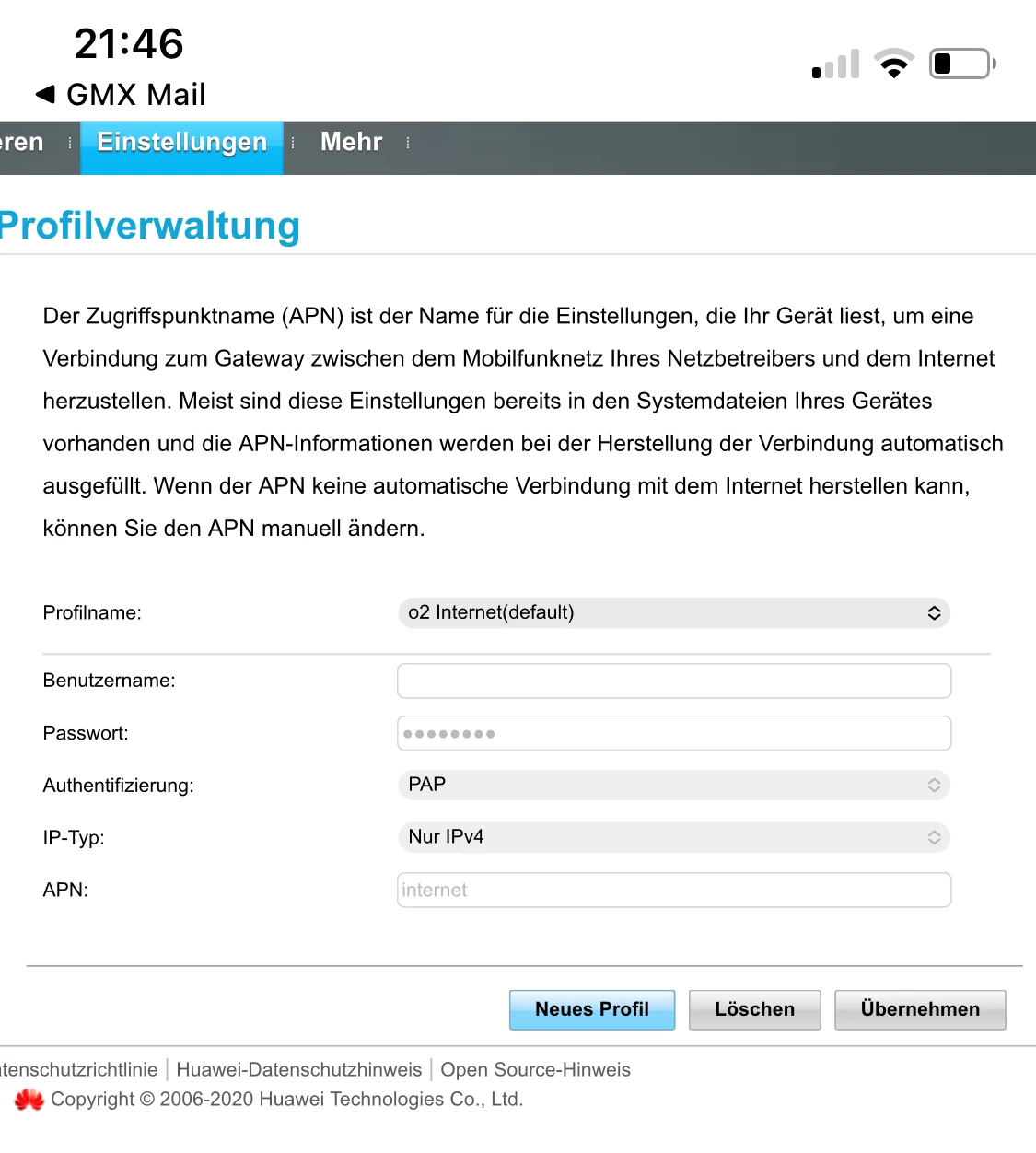 Damit fällt mein Verdacht mit Band 20 aus. Das Einzige, worum ich Dich noch bitten würde wäre, von beiden SIMs einen Screenshot von den APN-Einstellungen zu machen und hier zu zeigen, sowie vom Empfangsstatus jeweils im Huawei.