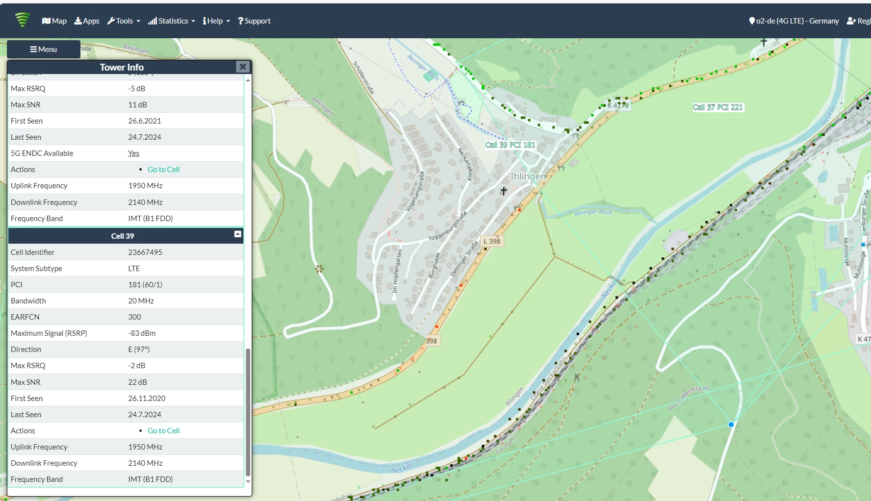 Der nächstgelegene Turm mit BAND 8 und 20 ist tagsüber ständig überlastet und bietet eine niedrige Download-Geschwindigkeit. Weiter entfernt gibt es einen Turm mit 3 Bändern.