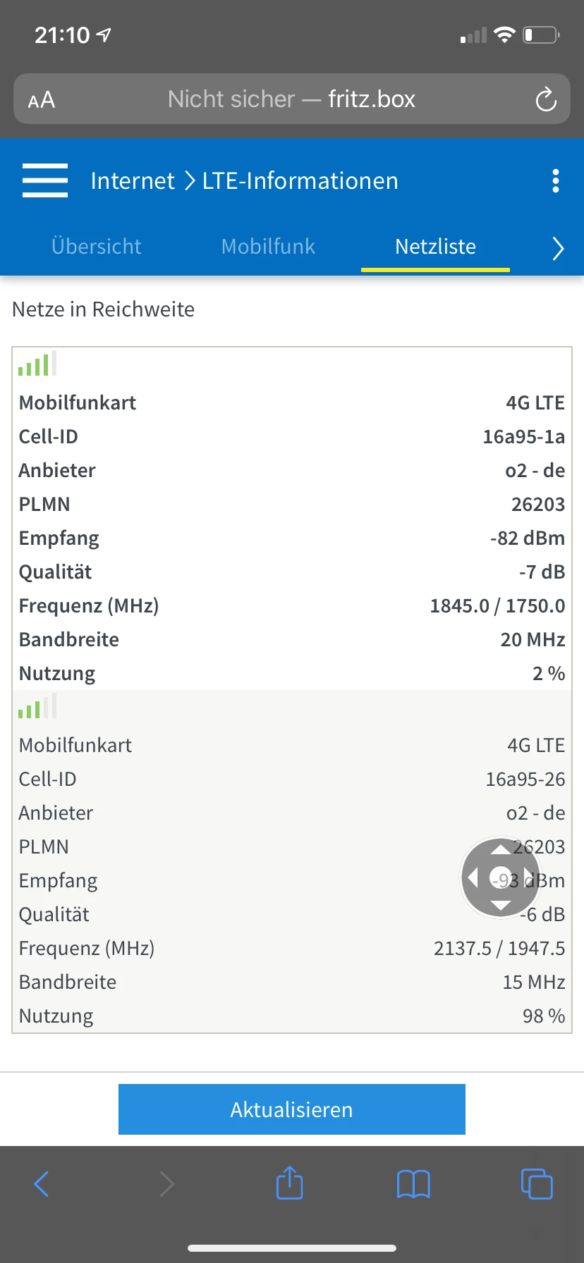 Diese Station bietet LTE Band 1 und 3 an, wobei deine Fritzbox aktuell das LTE Band 3 nutzt. Es gäbe in dieser Umgebung noch zwei andere Basisstationen, die eine gute Frequenzausstattung haben: