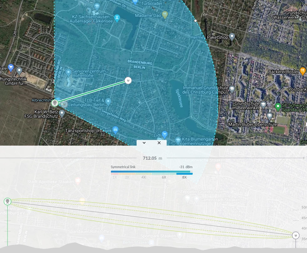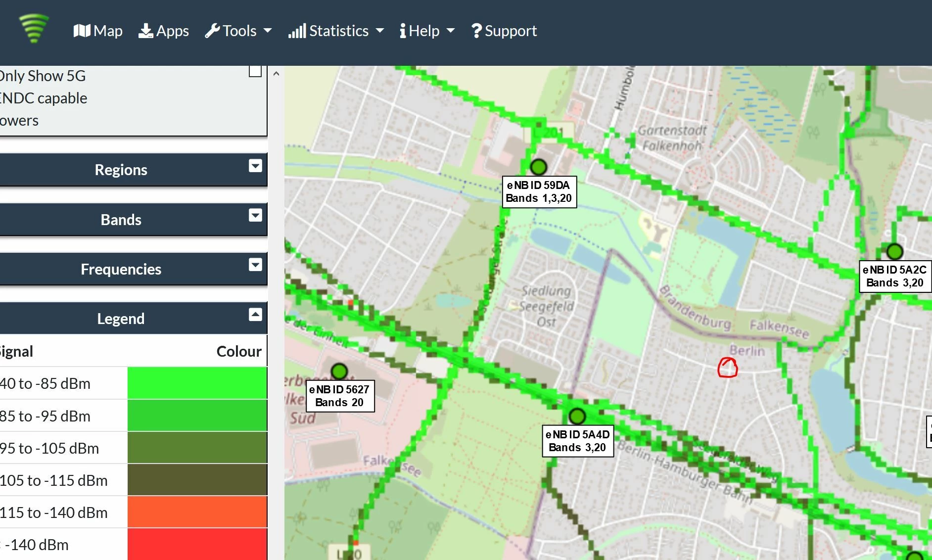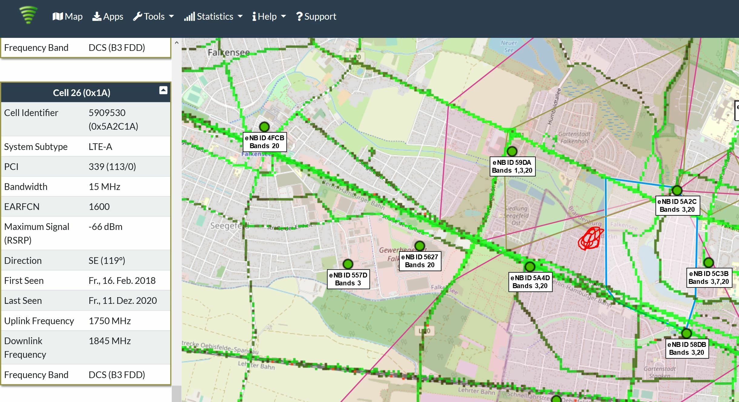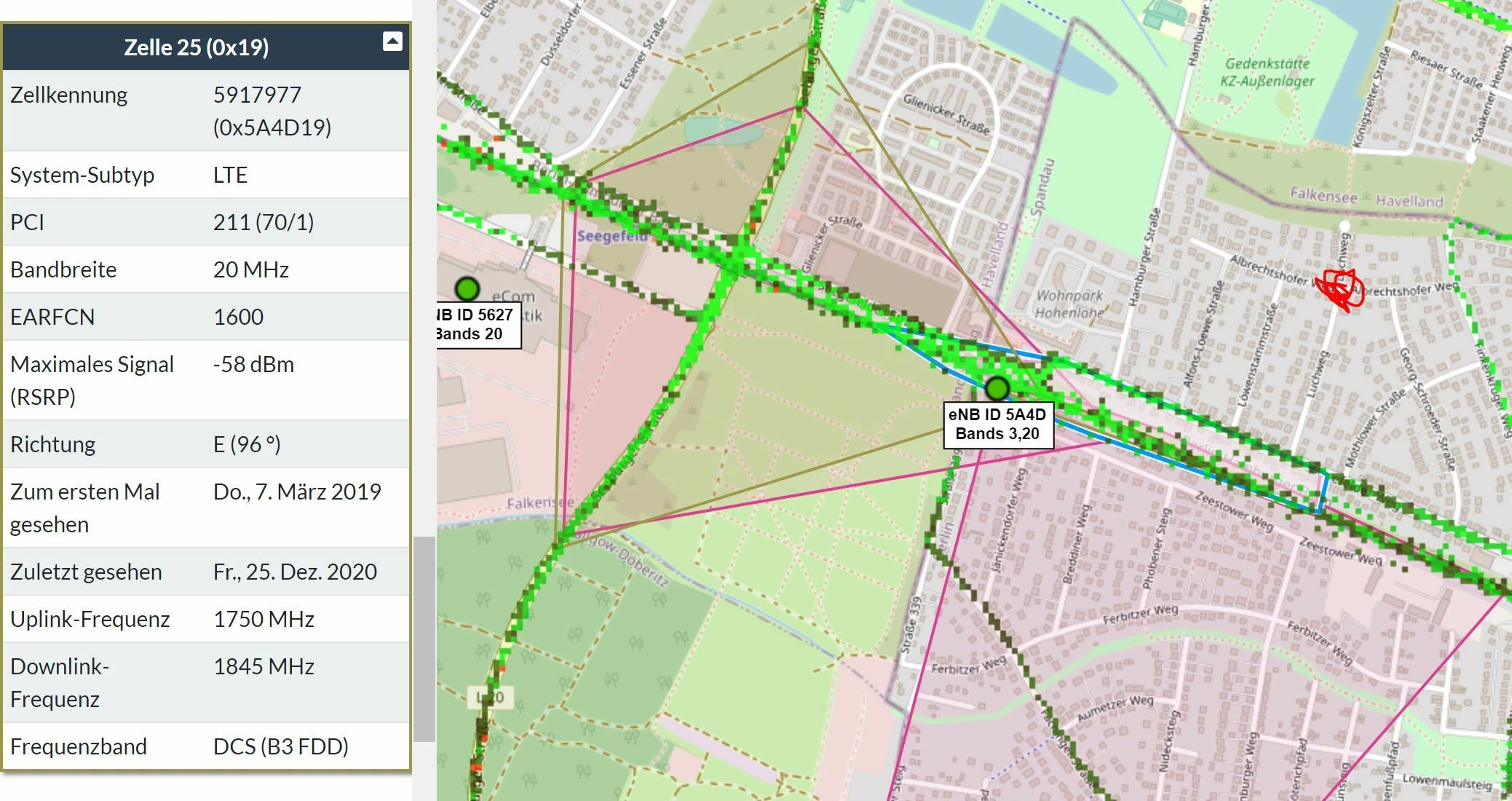 In welche Richtung ist deine Antenne gerade ausgerichtet? Die Station am “Zeestower Weg 50 13591 Berlin”, wäre eigentlich recht gut gelegen, und du wärst mitten im Antennensektor. Dazu müsste die Antenne in Richtung 253° (auf dem Kompass) ausgerichtet sein, und mit leichter Steigung nach oben (siehe Screenshot)