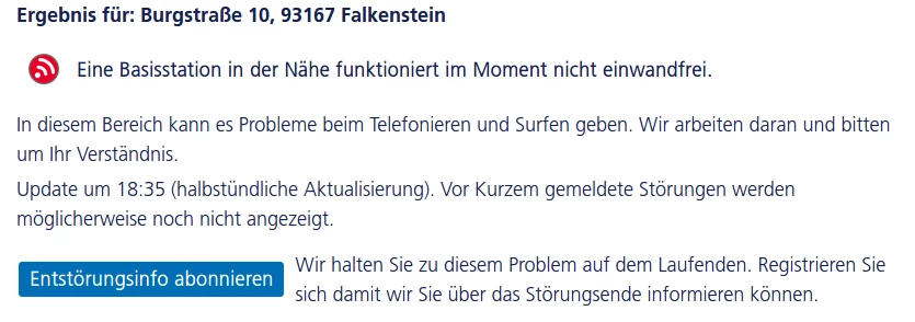 Wir haben seit gestern,den 17.07.2021 wieder einen Totalausfall, der dritte innerhalb der letzten zwei Monate. Am Wochenende ist der Ausfall am schlimmsten, weil vor Montag keine Störung behoben wird. Die Entstörungen dauern sowie fast immer 24 Stunden, meistens sogar länger.