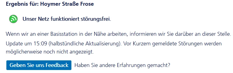 Ich hatte mir die verscheidenene Basisstationen in deiner Umgebung angeschaut und dort auch keinen Defekt finden können.