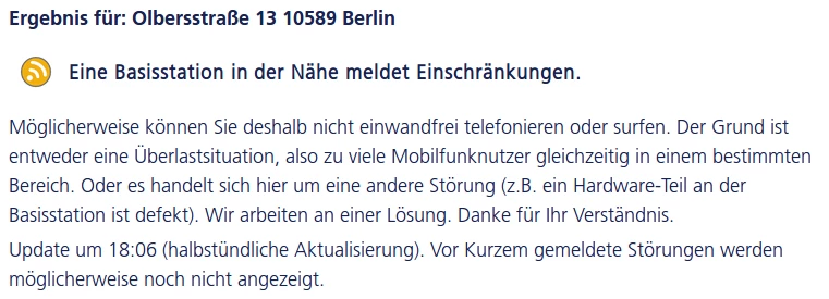 an der von dir angegebenen Postleitzahl 10589 besteht bei einigen Basistationen eine Einschränkung. Dementsprechend kann es in diesem Gebiet zu Störungen kommen. Leider hab ich keinen Kenntnis darüber, wann die Einschränkungen behoben werden 😞 .