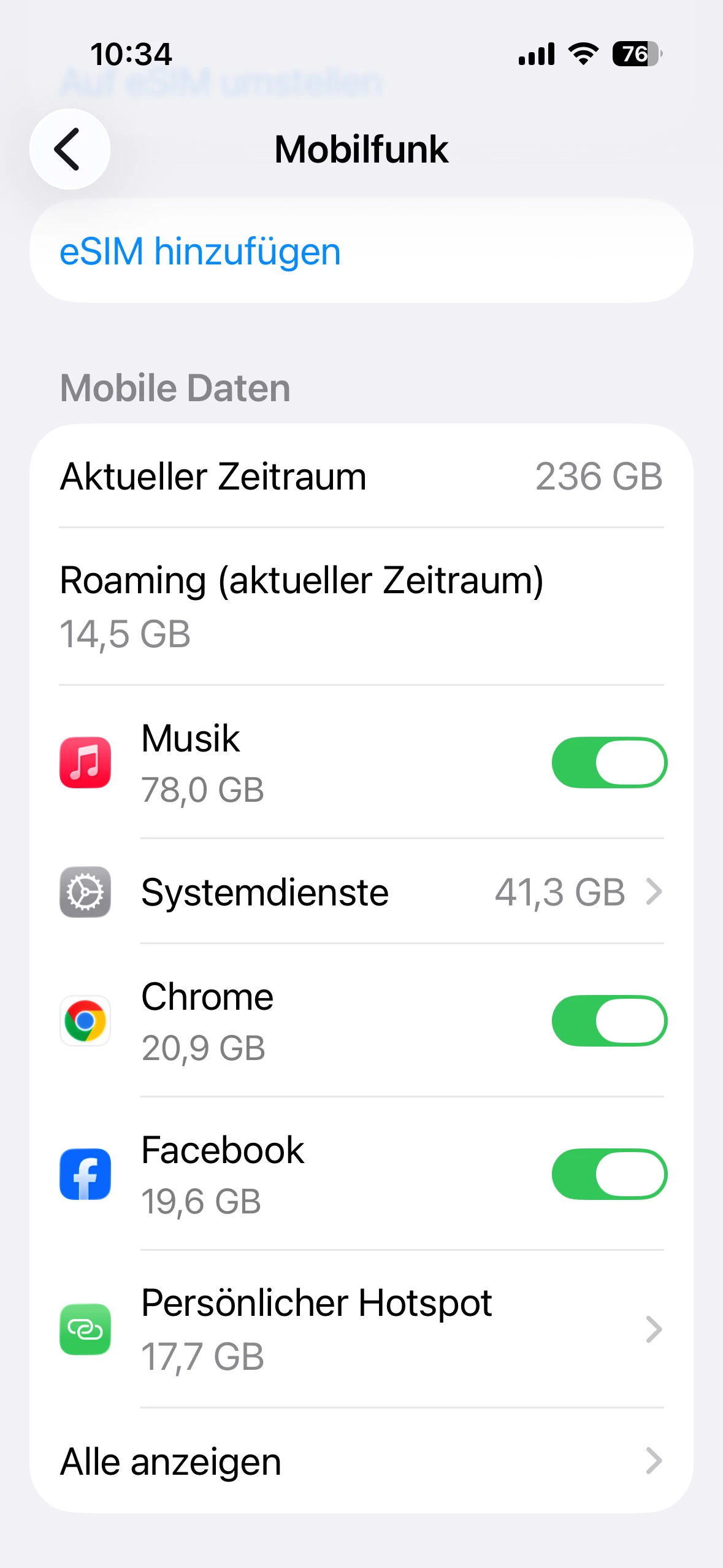 Bei mir ist die Musik von Apple Music mit 78 GB. Ich schick ein Foto mit ganz oben aber ich habe nichts in den Einstellungen geändert Monat für Monat und nun auf einmal sind in den ersten vier Tagen 12 GB Datenvolumen weg das ist doch ein Fehler?????