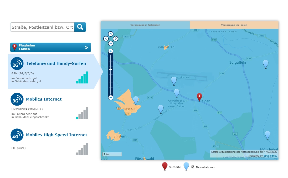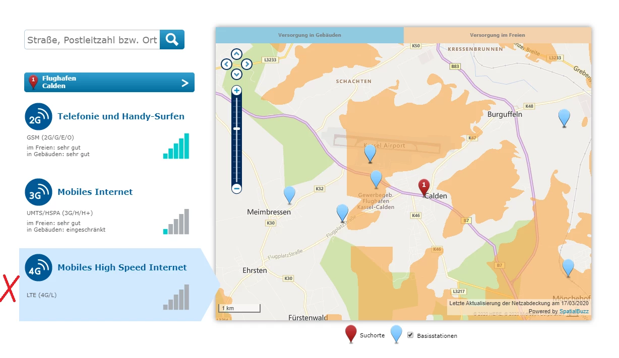 Beispiel: Ich mache eine Abfrage für Flughafen Calden und bekomme die Abdeckung für GSM(!) als erstes angezeigt.