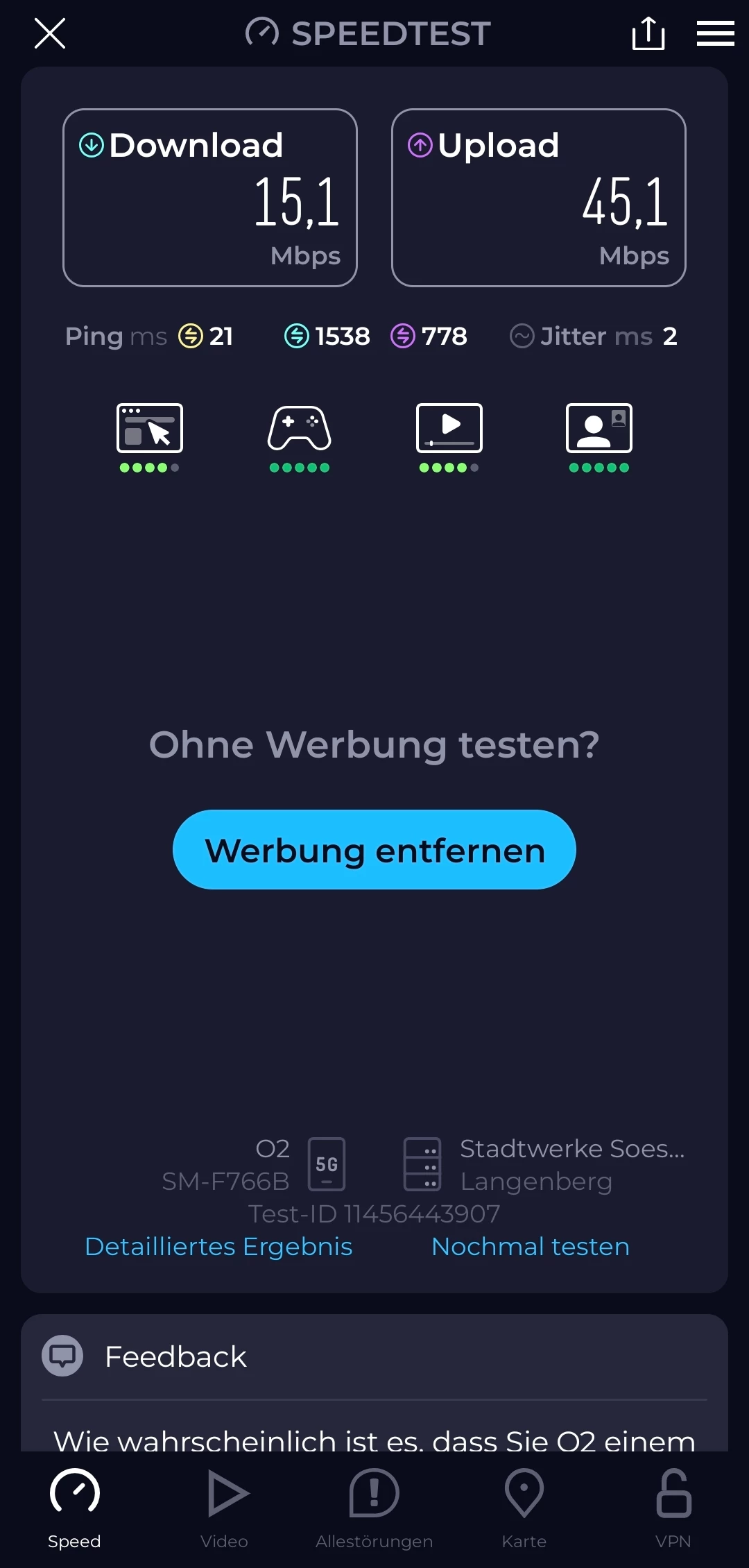 Wohne in Gütersloh Innenstadt. Laut ​@o2_Maria Ist der 5G Netz für den Bereich ausgebaut. Speedtest wurde um 22Uhr gemacht. Smartphone Samsung Flip Z7. Also auch 5G fähig.