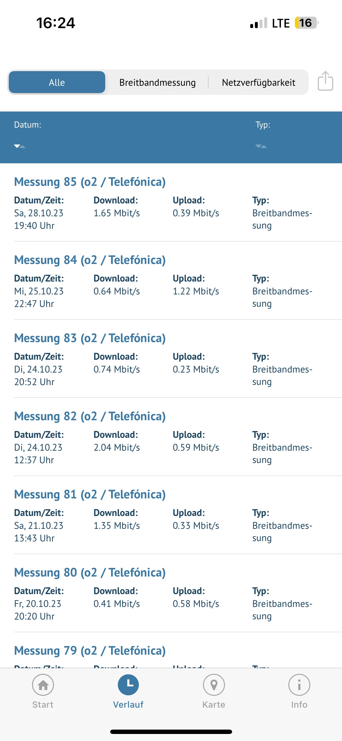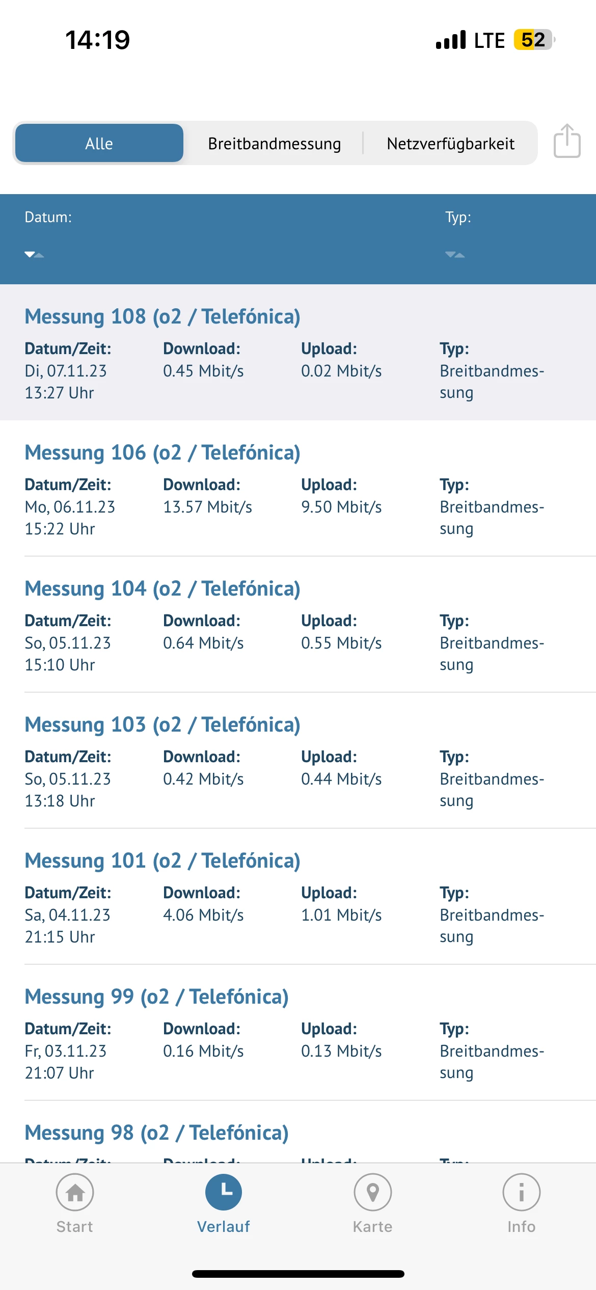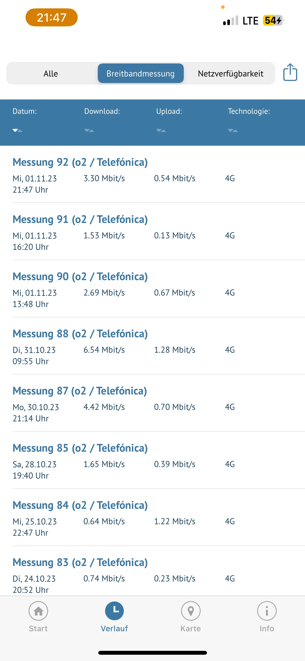 Die sim Karte wurde im Januar 23 getauscht (bin mir nicht mehr so sicher ob es Januar war). Ich war bereits im Shop aber auch diese haben mir nicht viel weiter geholfen. Alles was gesagt/vorgeschlagen wurde, wusste ich schon und habe ich auch schon ausprobiert. Ich messe fleißig weiter. Samstag Abend habe ich in einer anderen Stadt gemessen, kaum Unterschied zu Meinem zuhause. Ist ebenfalls anbei.