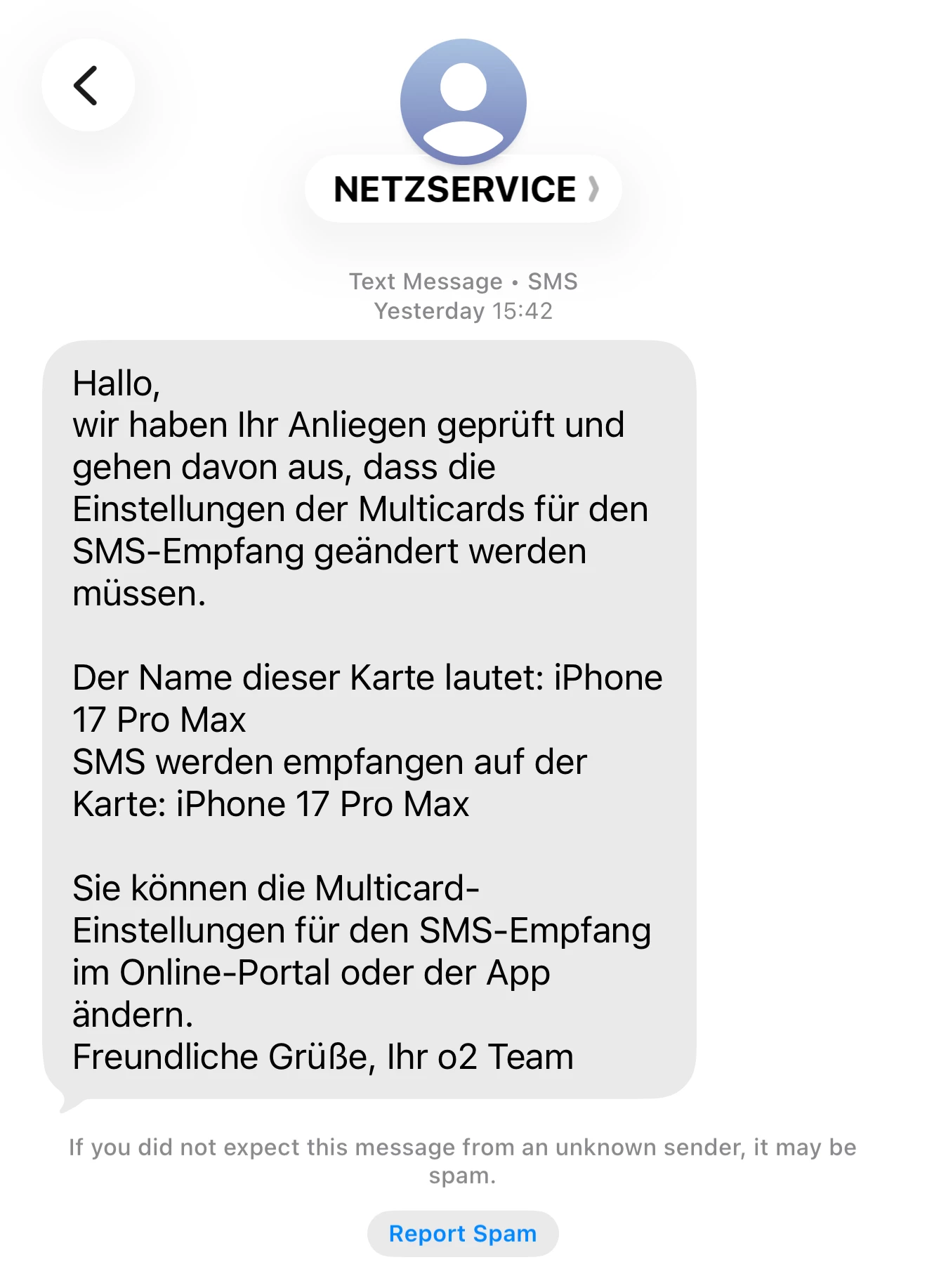 Stattdessen erhielt ich nur die Information, dass die Nachrichten derzeit an die SIM „iPhone 17 Pro Max“ zugestellt werden – was mir selbstverständlich bereits bekannt war 😁