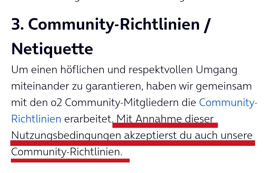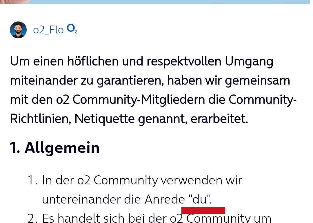 Höflichkeit und Respekt sowohl anderen Usern als auch uns Moderator:innen und unseren Mitarbeiter:innen gegenüber ist für uns als o2 Community sehr wichtig. Bitte beachte, dass wir bei wiederholten Verstößen eine Schreibsperre verhängen können.