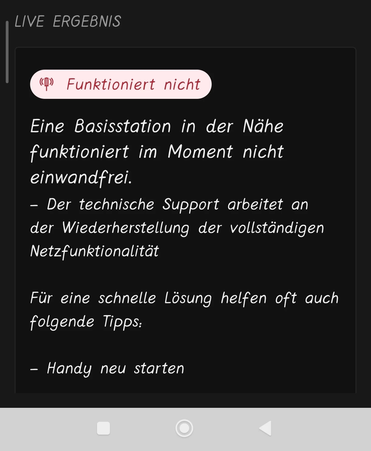 danke für die Nebenstraße, ich hatte nochmal nachgeschaut. Es passt zeitlich: Zwei Tage bevor du dich hier gemeldet hast, hat eine Basisstation Einschränkungen gemeldet. Leider ist noch kein Entstörungsdatum einsehbar, ich hoffe es wird aber zügig behoben.