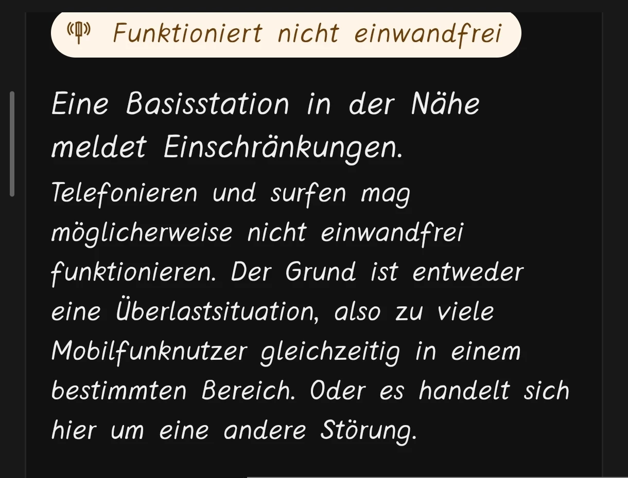 Hallo ​@Beast2106, vielen Dank für deine Rückmeldung. Ich habe die Situation noch einmal geprüft: Aktuell liegen an der gemeldeten Basisstation keine Einschränkungen vor und hoffentlich bleibt das auch so. ✊🙂 Da bei dir weder DSL, Kabel noch Glasfaser verfügbar sind, verstehe ich gut, dass du auf das Mobilfunknetz angewiesen bist. Dann ist es natürlich wichtig, dass dieses zuverlässig funktioniert.😐