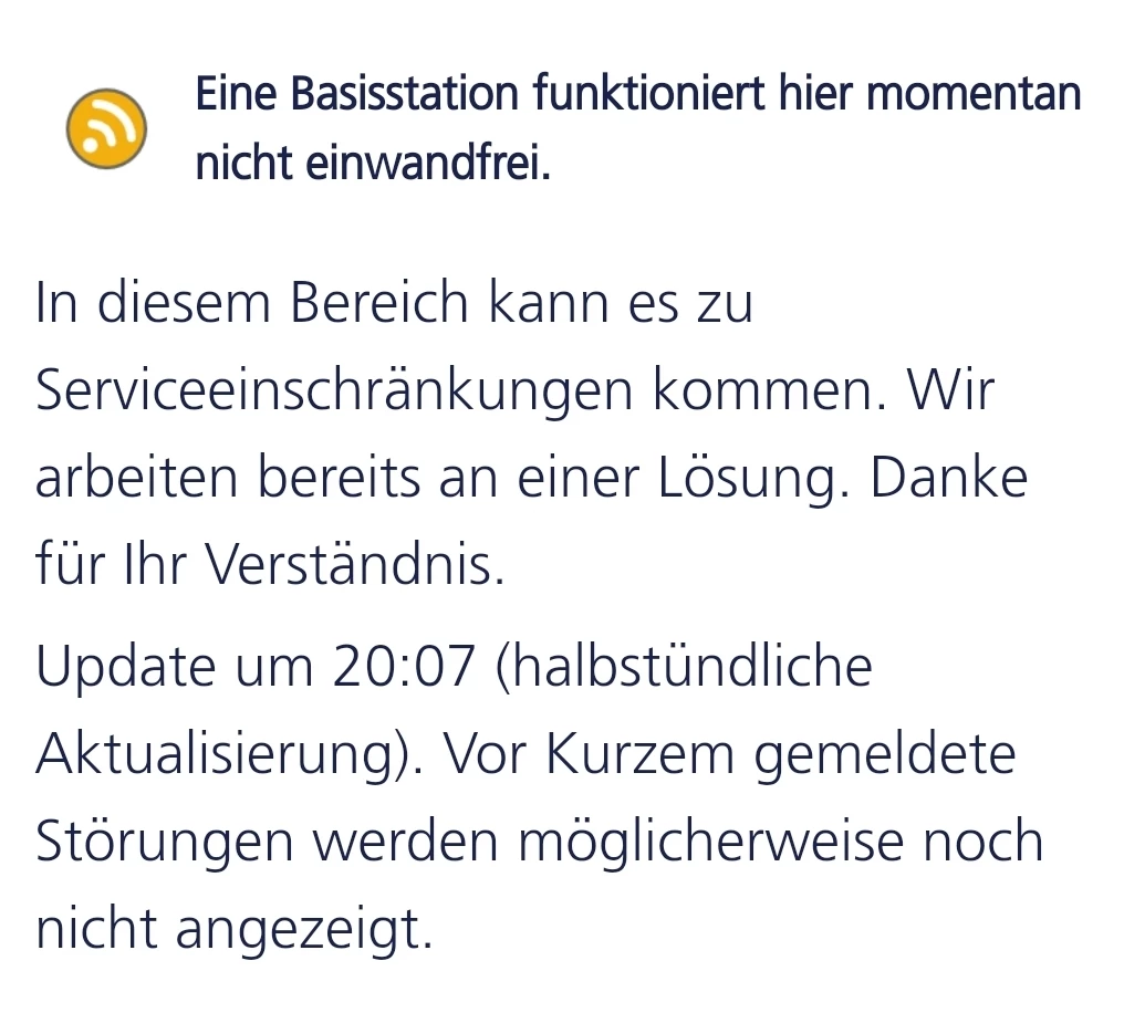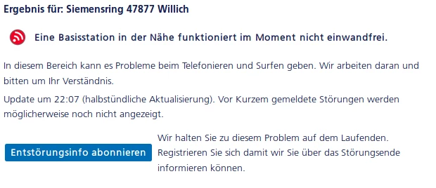 die aktuell im im Livecheck angezeigte "gelbe Ampel" betrifft allerdings nicht deine Basisstation, sondern die Basistation im " Siemensring 4 47877 Willich".