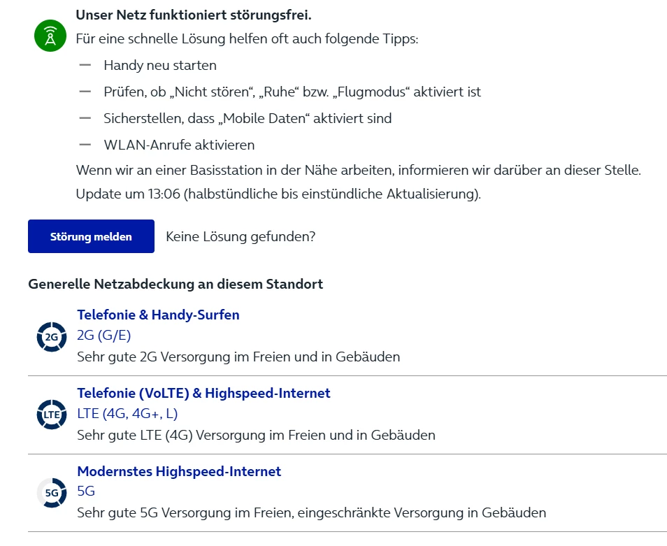 ich habe die Netzabdeckung an deiner Adresse gerne einmal geprüft, aktuell werden dort aber keine Störungen gemeldet.