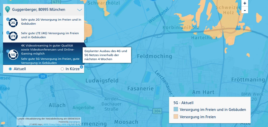 Wobei man hier das Datum der letzten Aktualisierung beachten sollte. Die Netzabdeckungskarte ist momentan auf Stand 09. September 2024.