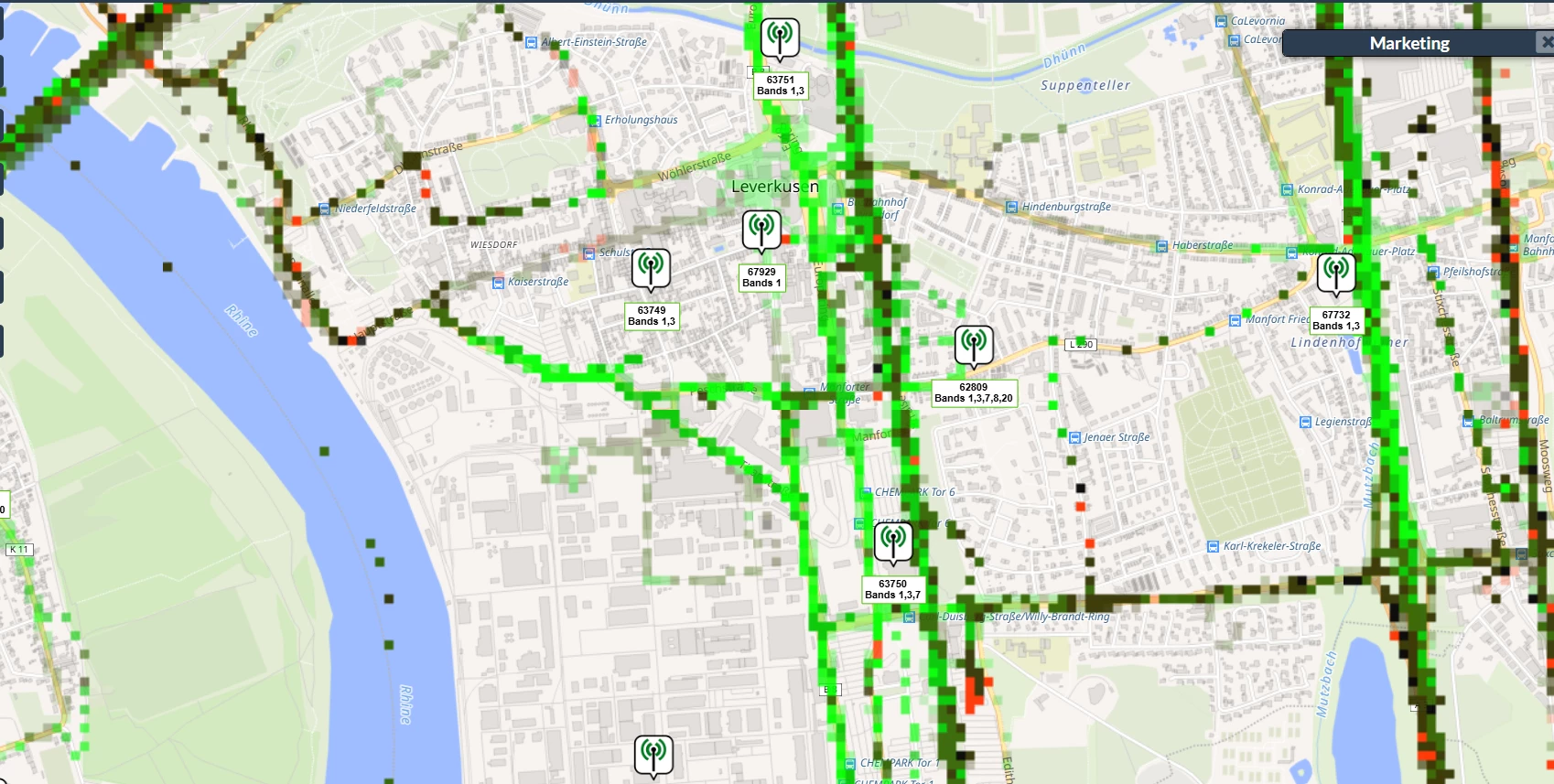 Ausschnitt der Gegend um die Manforter Straße aus dem o2 Livecheck