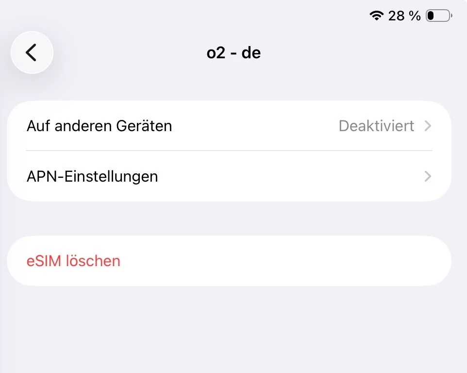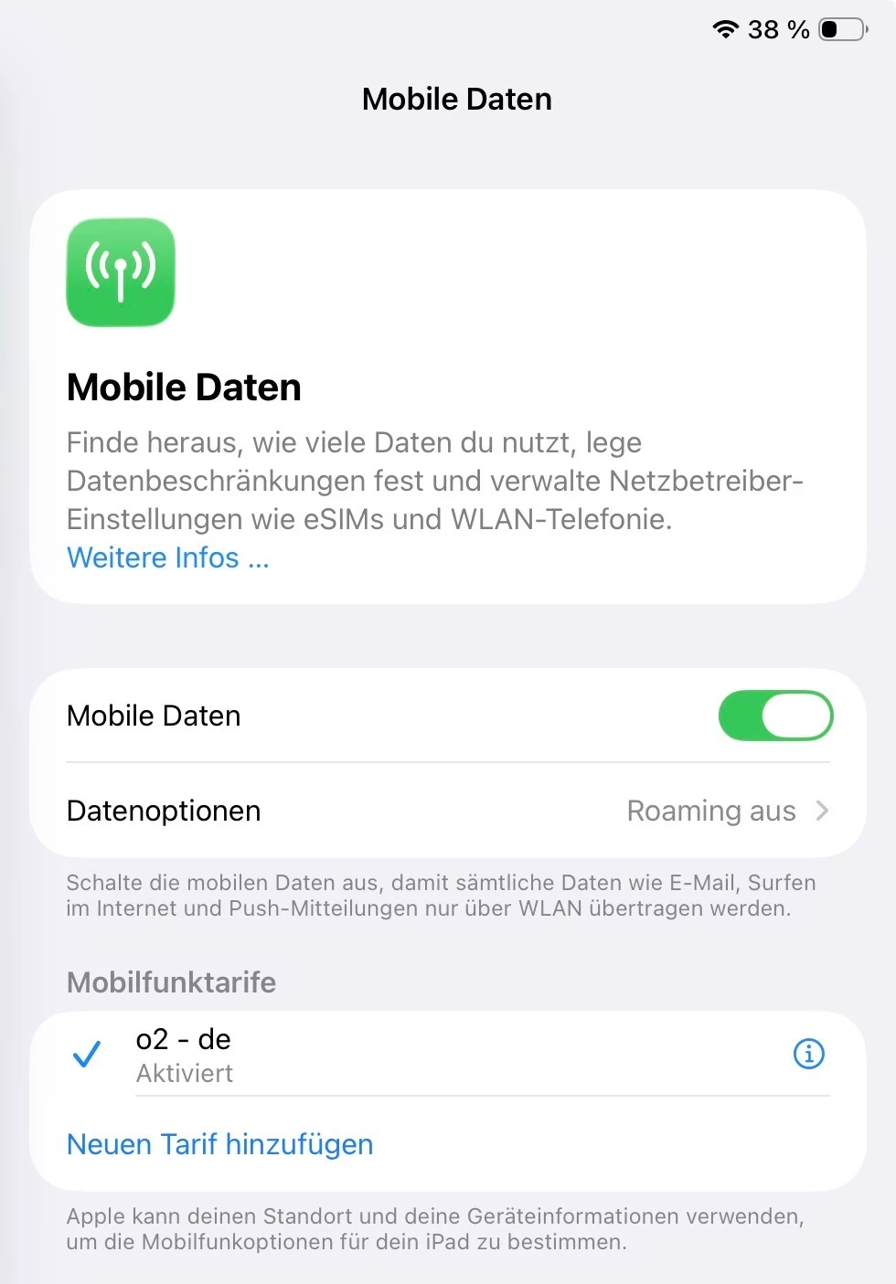 Die alte eSim habe ich gelöscht und eine Neue Data eSim online bestellt. Nach dem ich die Info bekam das ich die neue eSim aktivieren kann hab ich das getan. Auf dem neuen Tablet habe ich auch die neue eSim eingescannt hat auch alles soweit geklappt. Nur leider bekomme ich keinen Zugriff auf das Internet. Vorher bei dem alten Tablet war auch oben in der Leiste ein Symbol das Signalisierte das ich Internet Empfang habe jetzt bei dem neuen Tablet ist oben in der Leiste nur das WLAN Symbol wenn ich mit dem WLAN verbunden bin sonst nichts. Bevor ich mich jetzt an Apple wende muss ich natürlich wissen ob es evtl. an O2 liegt.