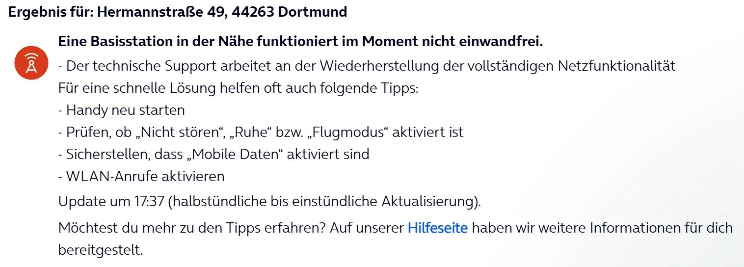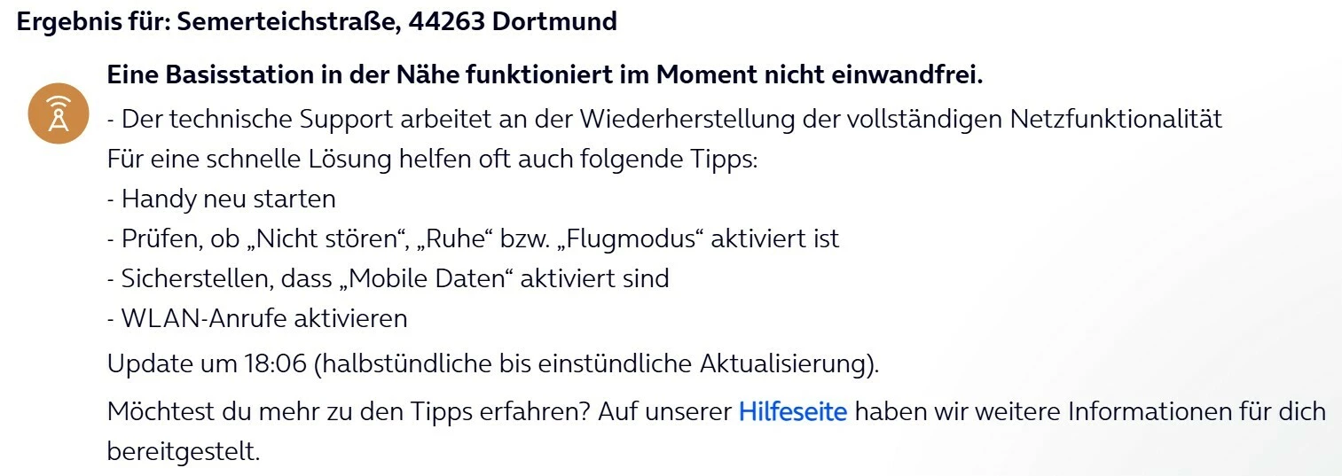 Hallo. Ja es sind Orte die nicht weit voneinander entfernt sind. Aber auch z B. In der Dortmunder Innenstadt ist es un Gebäuden so. Auch in der ubahn habe ich garkein Empfang obwohl ich an vielen Haltestellen sonst Empfang hatte. Die Orte sind in 44263 Z. B Hermannstraße 49 oder auch bei 44263 Semerteichstr 188. Das ist nicht weit voneinander entfernt und das sind nur einige Beispiele. Vor einige Monaten hatte ich da normalen Empfang und jetzt echt nichts.
