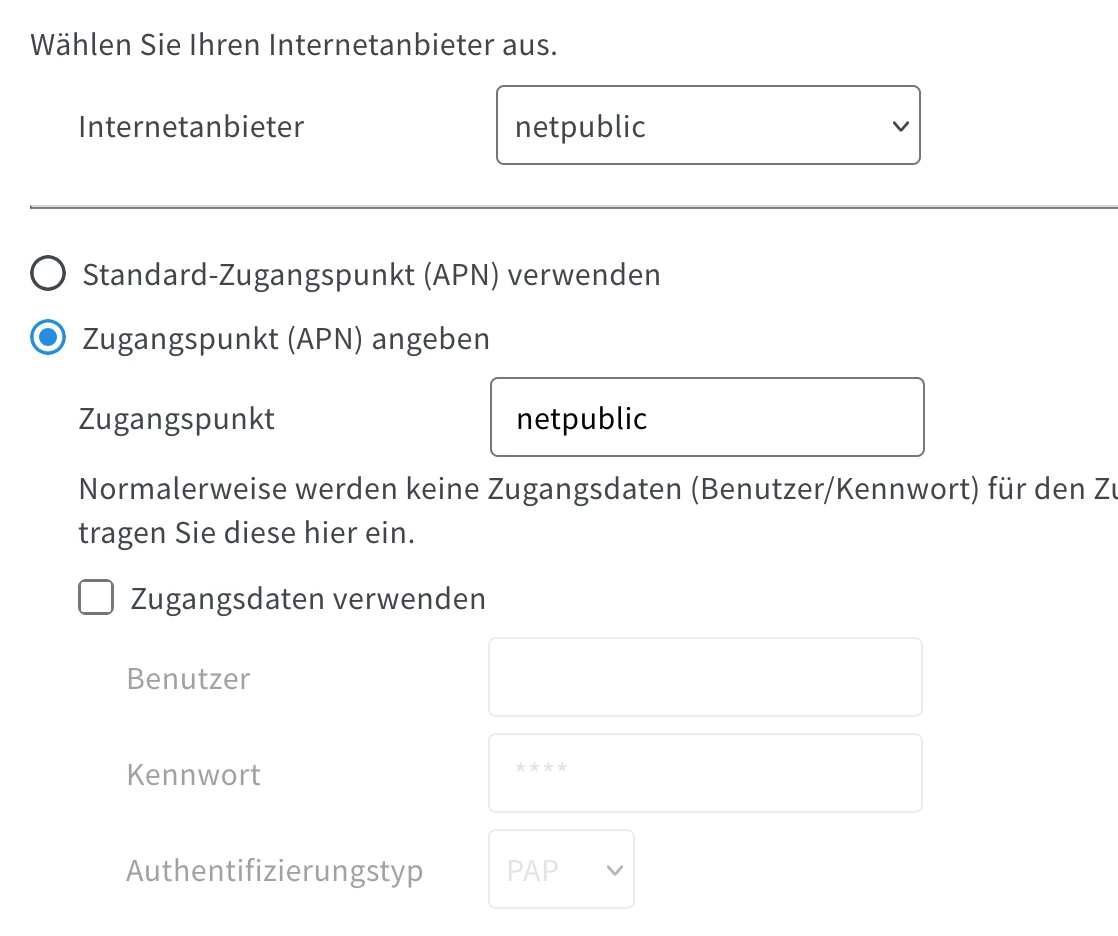 ich habe mir vor einigen Tagen eine öffentliche IPv4-Adresse (NAT-Typ 2) für meine SIM (mit ICCID ...254) beim O2 Support gebucht. APN auf “netpublic” umgestellt, DynDNS eingerichtet, hat direkt funktioniert. Am nächsten Morgen war mein Homeserver nicht mehr über meine Domain erreichbar. Ich schaue also im Interface der FRITZ!Box nach und siehe da, nach der üblichen Zwangstrennung gegen 0 Uhr habe ich, wieder Erwarten, eine private IP (10.x.x.x) bekommen. Das Verwirrende: Die FRITZ!Box gibt im Diagnose Menü an, den netpublic APN für die Verbindung verwendet zu haben… Nach einem manuellen reconnect bzw. einem Neustart des Routers wird wieder eine öffentliche (46.114.x.x) Adresse zugewiesen. Dieses Verhalten konnte ich jedes Mal reproduzieren, wenn automatisch eine neue Verbindung aufgebaut wird. Jetzt also meine Frage: Habe ich etwas falsch konfiguriert? Falls nein: Liegt es eher an der FRITZ!Box, die trotz Konfiguration die Standard-APN verwendet oder wird mir tatsächlich seitens O2 trotzdem eine private IP mit CGN zugewiesen?