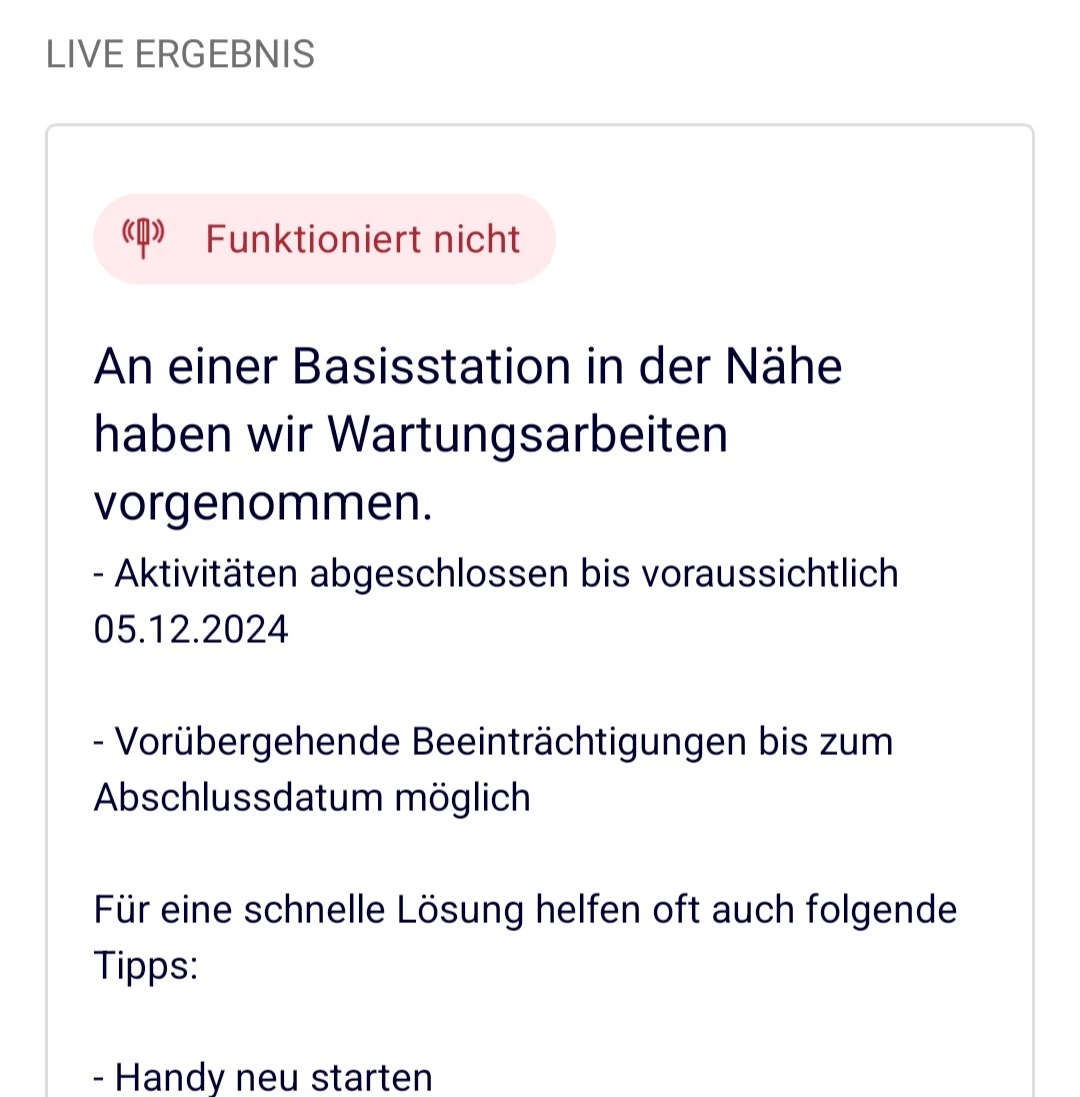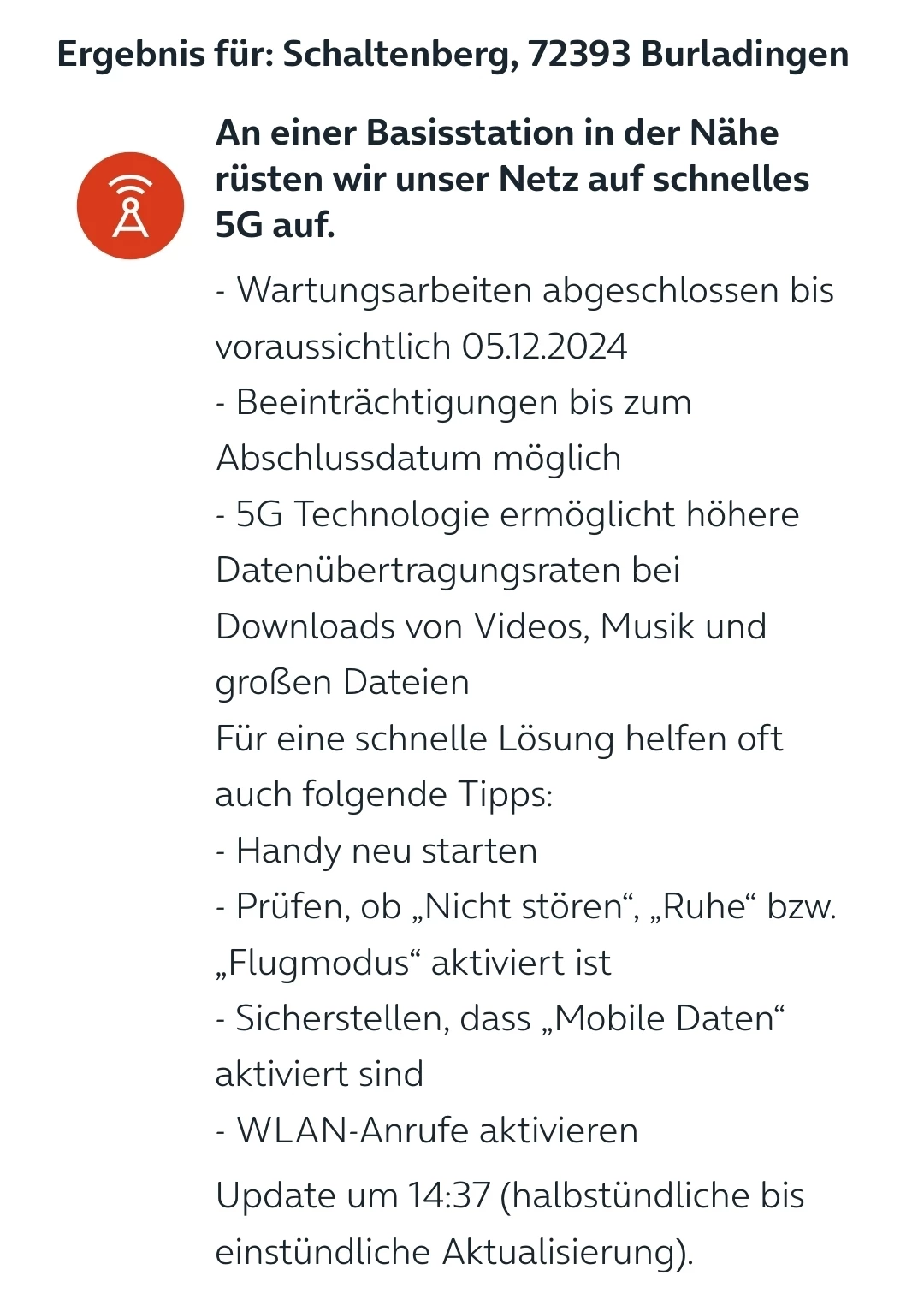 Wie ich höre ist die eNB 91316 in Burladingen schon wieder ausgefallen. Meine Familie dort hat heute die Kündigung eingereicht. Das habt ihr halt davon, wenn ihr nur eine B20 Zelle mit der ranzigsten Richtfunkanbindung hinstellt.