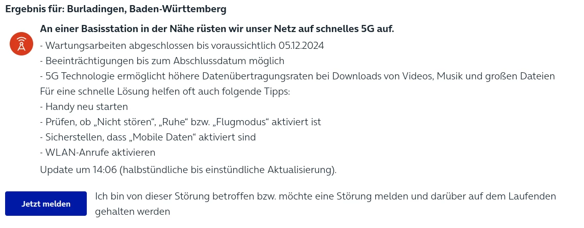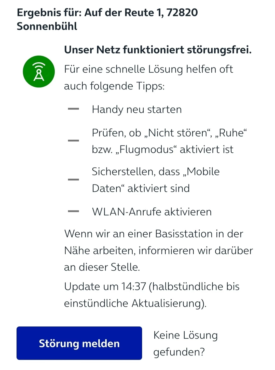 Naja egal, wir legen den Fall zu den Akten. Kann sie aber verstehen, ich habe euch auch schon mehrfach eine seit mehreren Jahren ausgefallene Zelle im Nachbarort Erpfingen gemeldet und beiße mir daran die Zähne aus, weil von euch behauptet wird, es würde alles funktionieren, obwohl meine Endgeräte etwas anderes behaupten. Bei mir daheim 50 Kilometer nördlich fällt die Zelle auch bei jedem leichten Gewitter aus, juckt euch auch nicht. Da kann ich jeden verstehen der da keine weitere Energie reinstecken will und das als Lehrgeld verbucht.