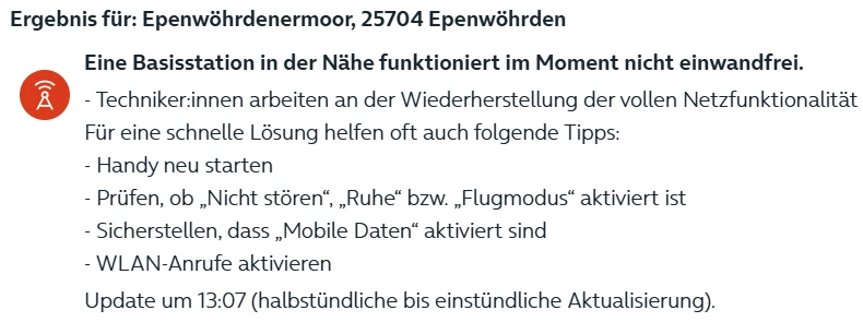 angezeigt werden in der Tat zwei Stationen mit einer Störungsmeldung, unsere in Meldorf und unsere in Hemmingstedt. Die Störung der Station in Meldorf betrifft 4G, die der Station in Hemmingstedt 2G.