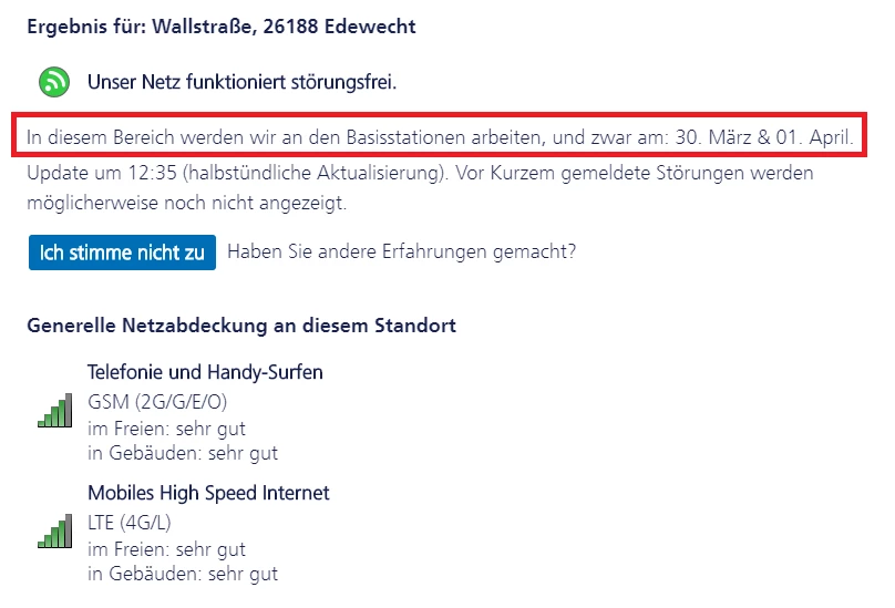 Eine Störung liegt laut O2 Kundenservice nicht vor. Darum bin ich so enttäuscht, da man sich nicht einmal per Telefon gemeldet hat.
