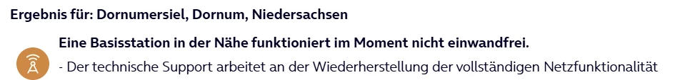 :blue_heart: -lich willkommen bei uns in der Community. Schön, dass du den Weg zu uns gefunden hast. :relaxed: Wie @bielo hier schon richtig angemerkt hat gibt es in Dornumersiel derzeit Einschränkungen bei der Netzversorgung. Unsere Techniker sind bereits informiert und arbeiten an einer Lösung. Leider lässt sich aktuell noch kein genaues Datum nennen zu wann die Einschränkungen behoben werden können.