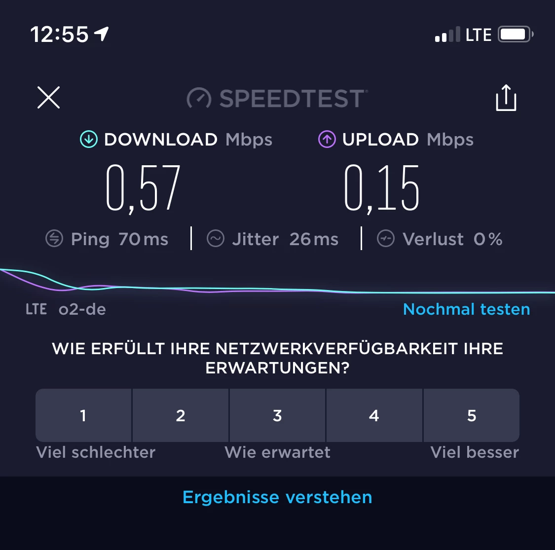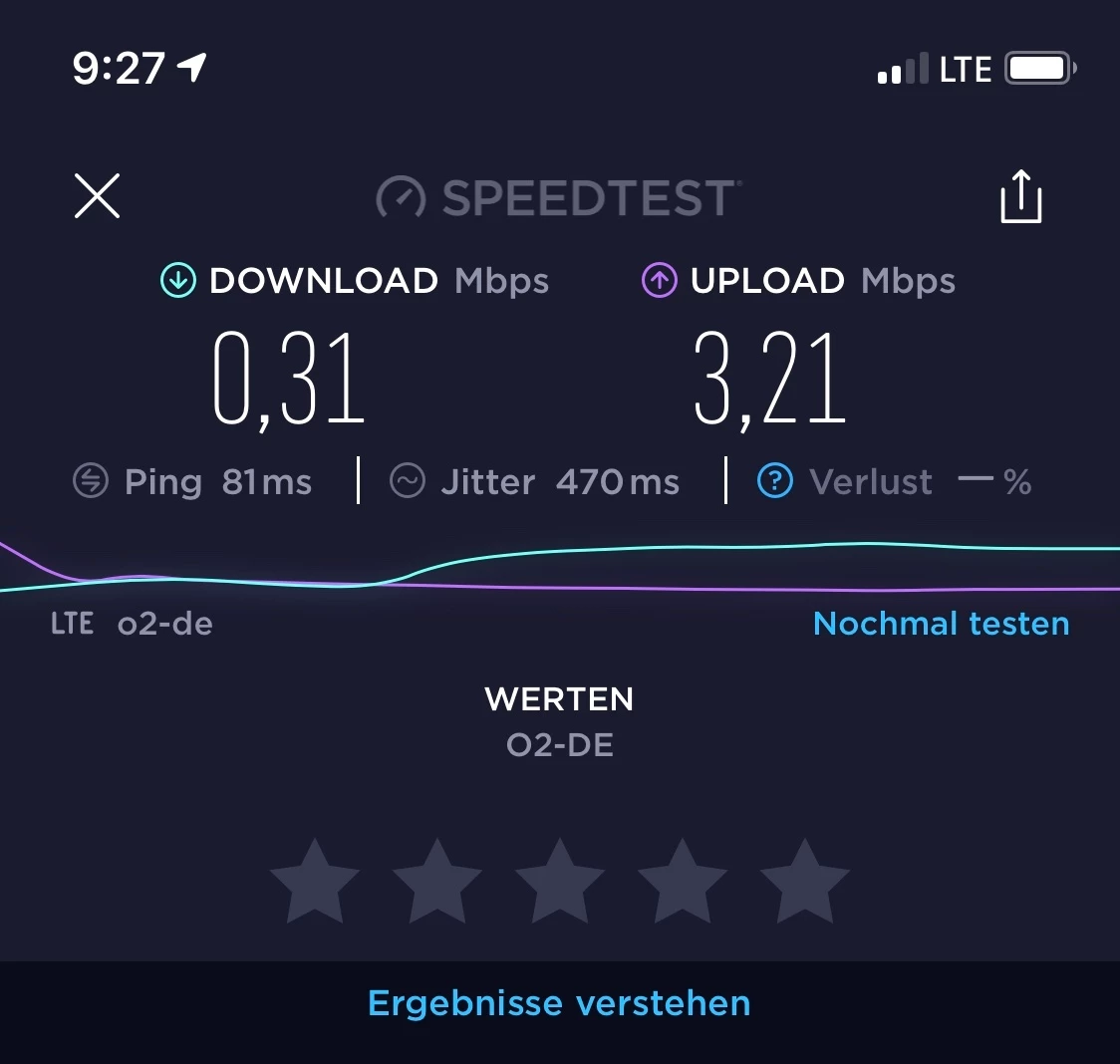 Egal ob zuhause oder unterwegs. Aktuell habe ich einen Download von 0,31 mbps, trotz LTE Verbindung und vollem Datenvolumen !!!