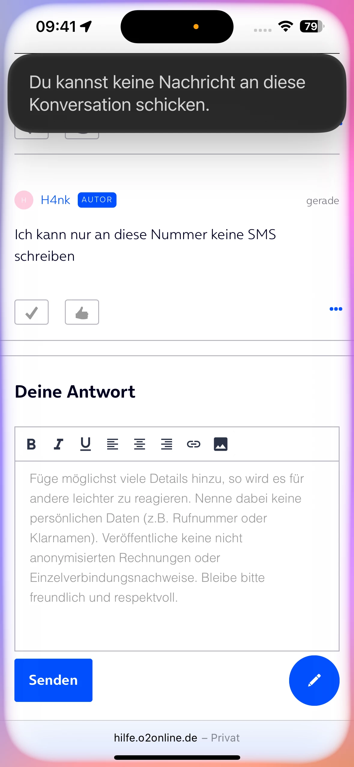 Habe ob demand und ich kann keine SMS mehr an die Nummer schicken mein iPhone blockt das Schreibfeld und wenn es über Siri probiere sagt er auch die Nummer kann keine SMS empfangen?!?