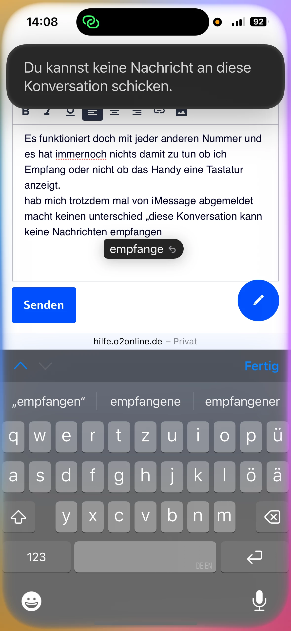"hab mich trotzdem mal von iMessage abgemeldet macht keinen unterschied „du kannst an diese Konversation keine Nachrichten schicken“